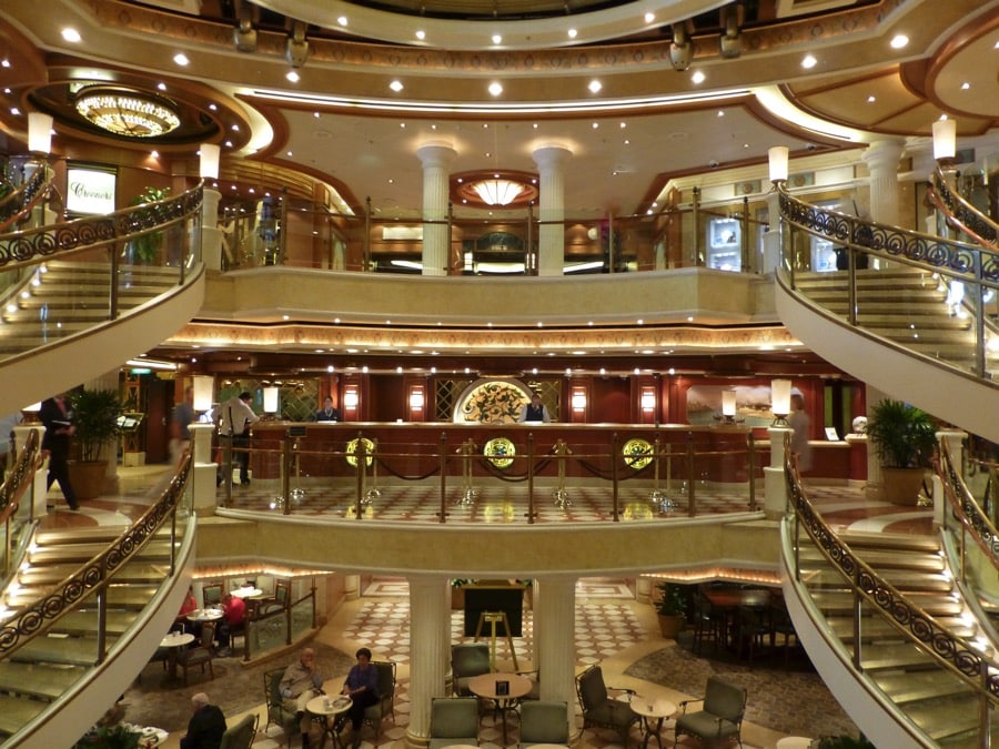 Het witte atrium vormt de prachtige binnenkomst. Met zijn drie dekken hoog is het atrium het middelpunt van het schip. Veel bedrijvigheid vindt hier plaats; bijvoorbeeld het welkomstwoord van de kapitein en het voorstellen van zijn officiers. Om ’s avonds hier rond te mogen lopen moet zeker gezellig zijn. Rondom het plaza vindt je de belangrijkste ontspanningsmogelijkheden maar ook bijvoorbeeld de receptie. Zo liggen de winkels rondom het atrium, de hoofdrestaurants er naast en is er een cafe met gebak en koffie’s. Je kan er gezellig zitten zodat je als het ware een soort Italiaans pleintje hebt.