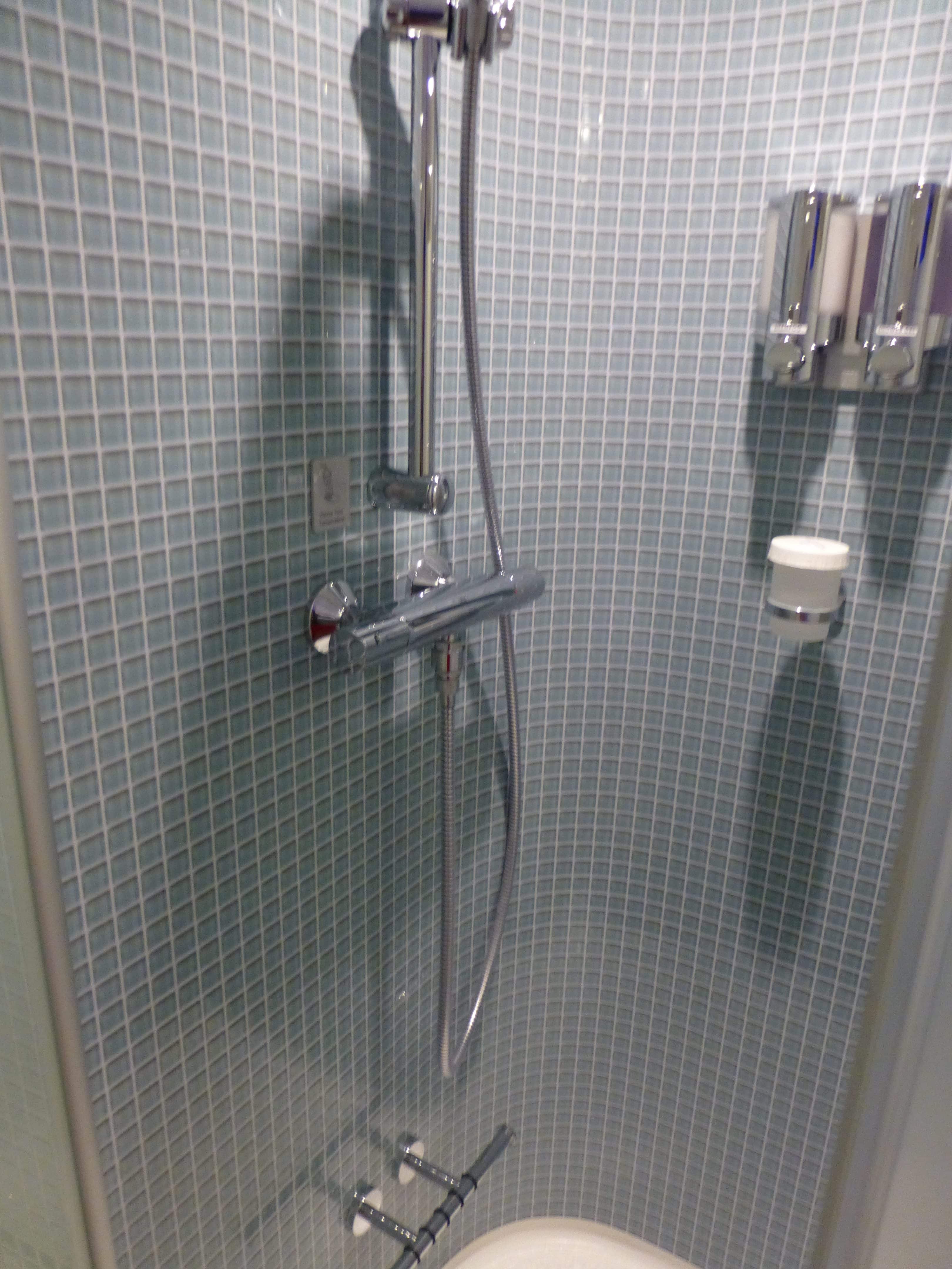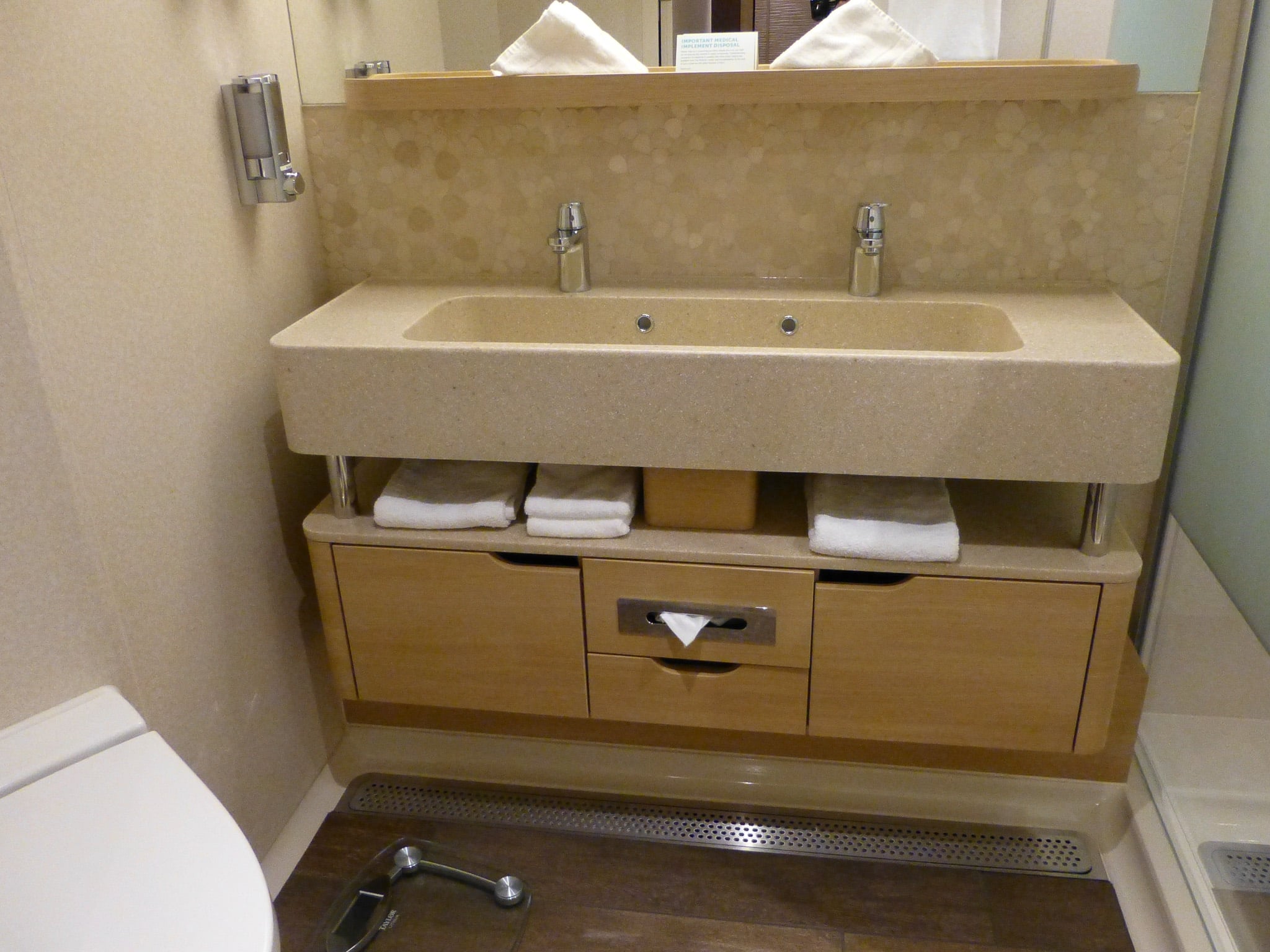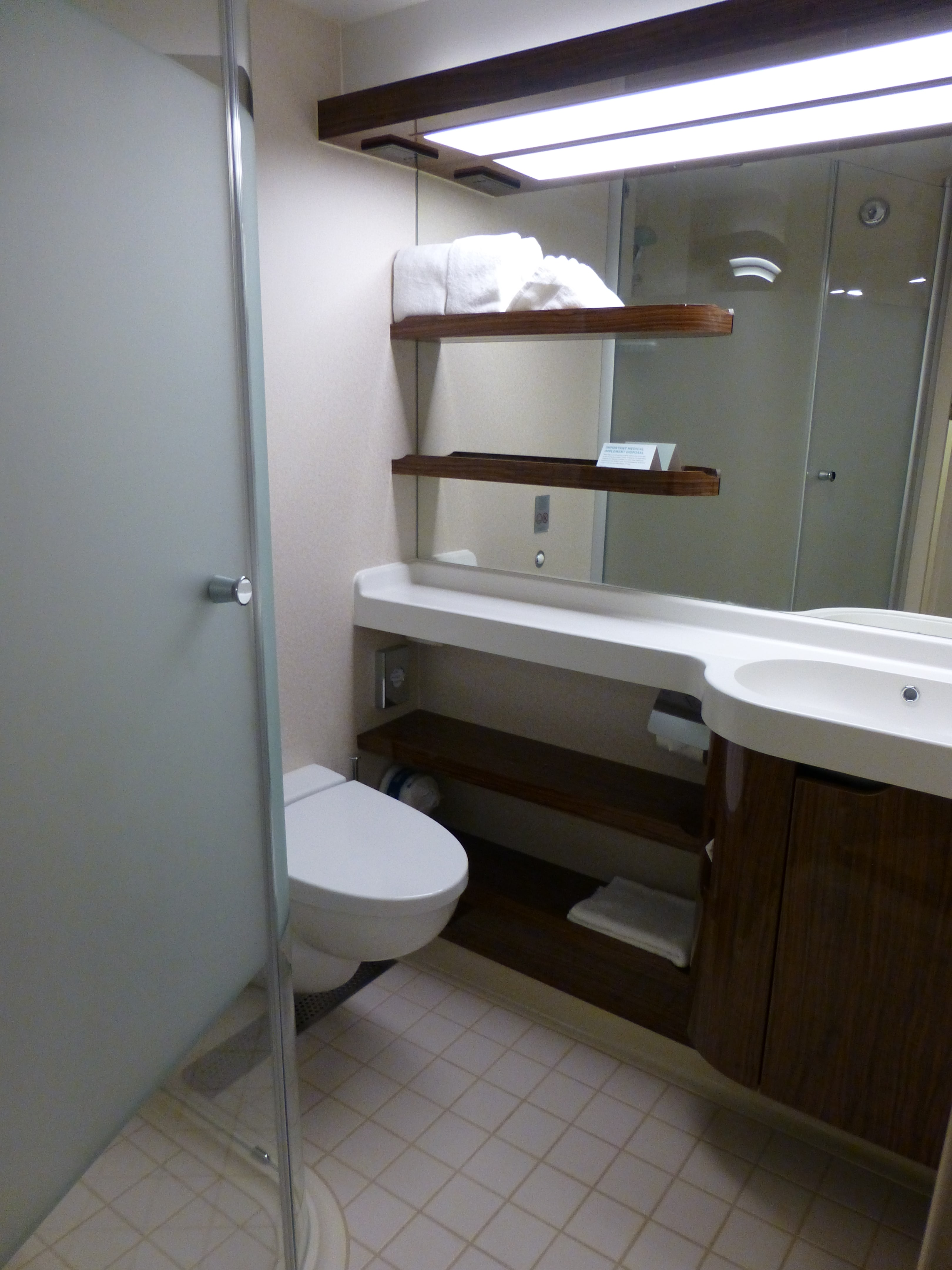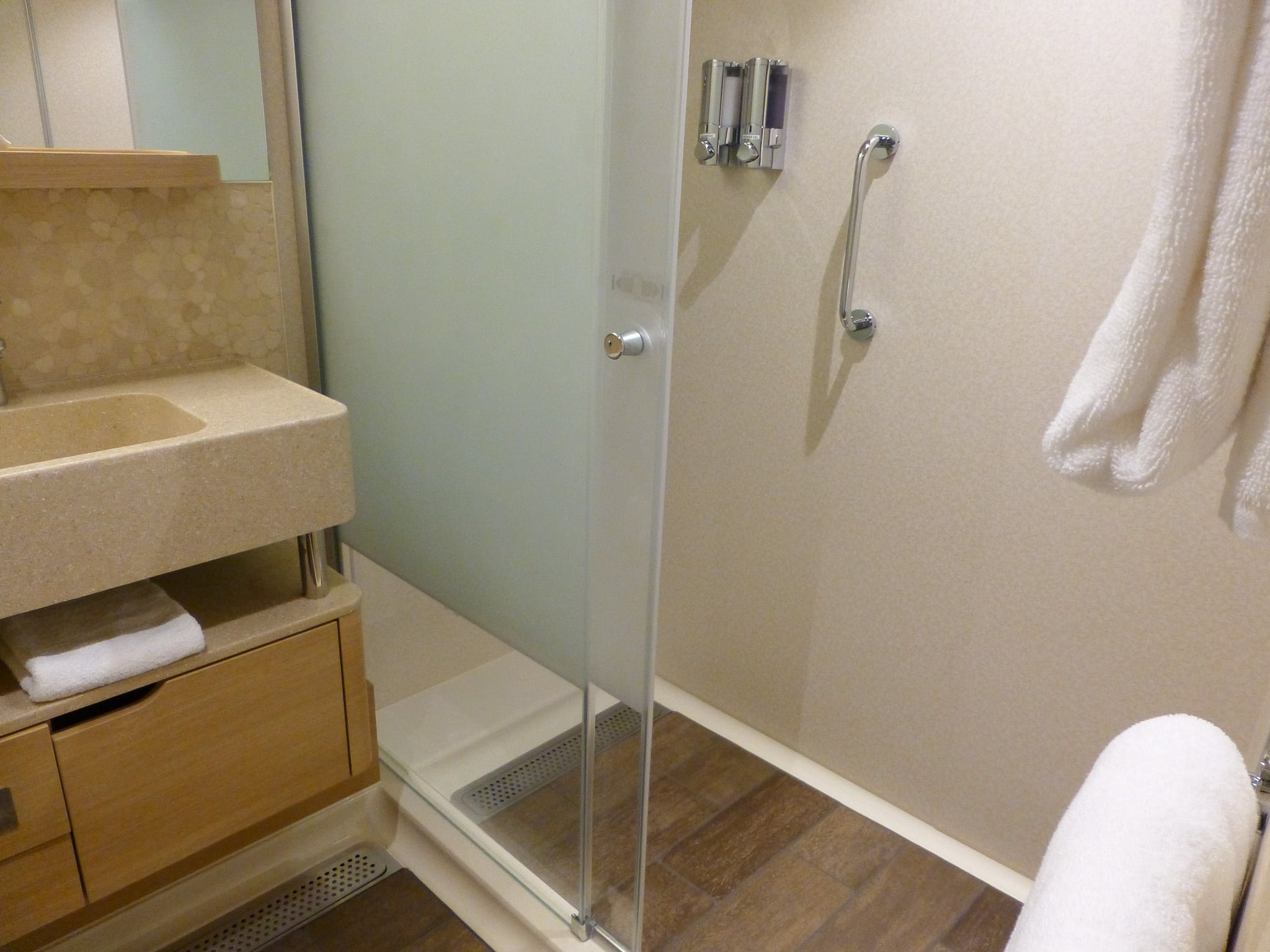 Elke hut vanaf de categorie binnenhut tot en met balkonhut heeft dezelfde badkamer, met een douchecabine, 1 wasbak, toilet en twee plankjes om wat op te zetten. Daaronder heb je nog twee planken die je kunt gebruiken om bijvoorbeeld een toilettas weg te zetten. De douchecabine heeft gedeeltelijk een ondoorzichtig gedeelte.