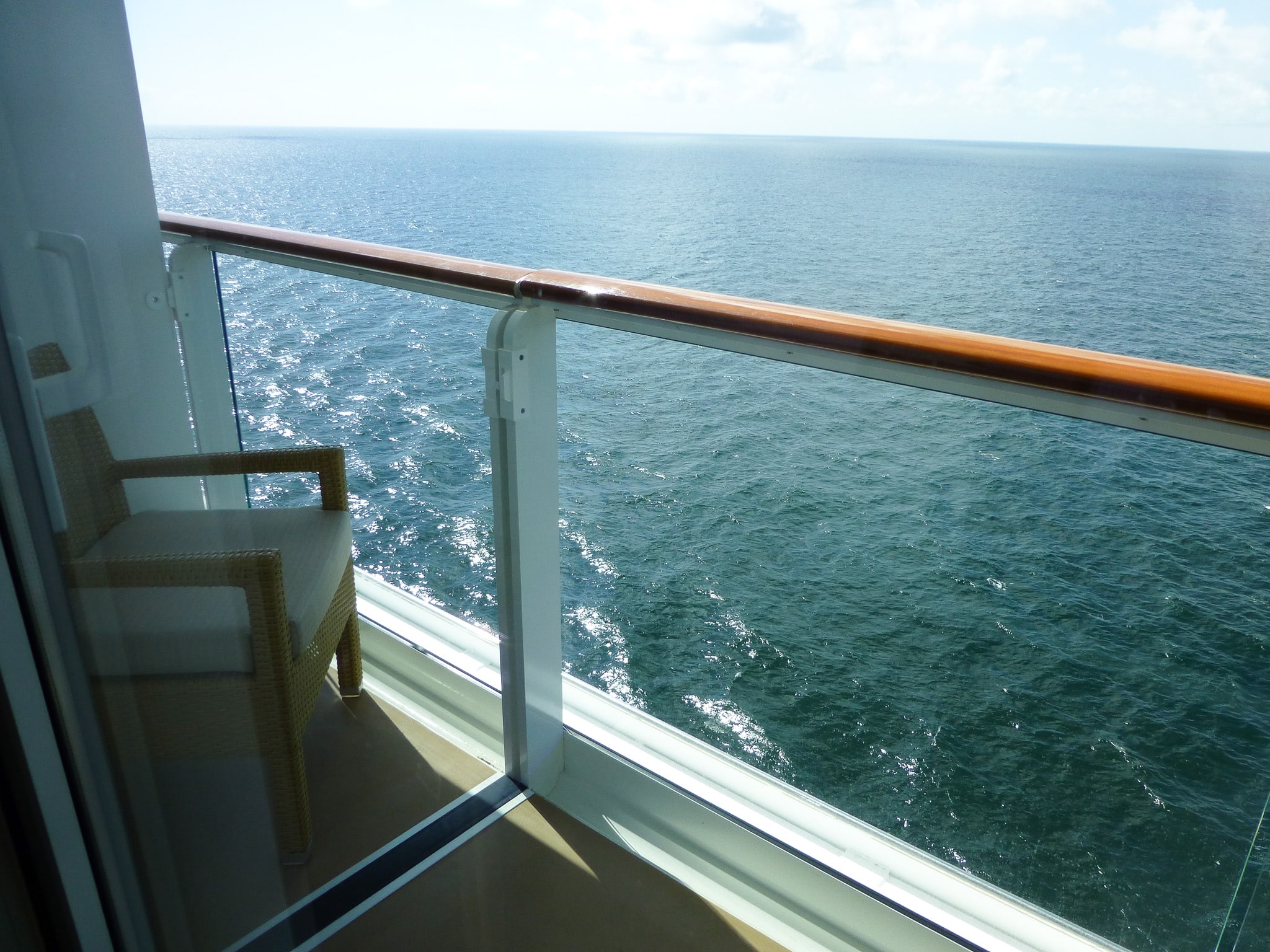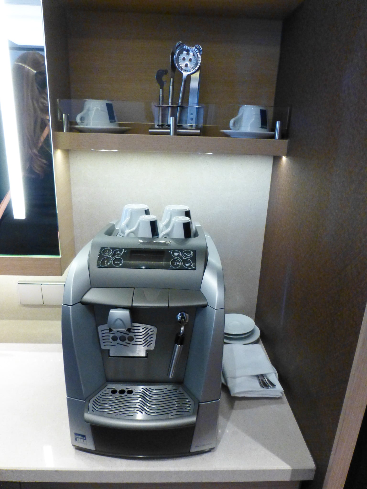 De balkonhutten (hieronder no 12780 – BA categorie, midscheeps) voelt fijn aan met 16 m2. Het bankje fungeert als extra slaapplek. Standaard krijgt elke hut (vanaf solo) een groot badlaken voor bij het zwembad. Hier vind je op het bureau bovendien een coffeemaker.