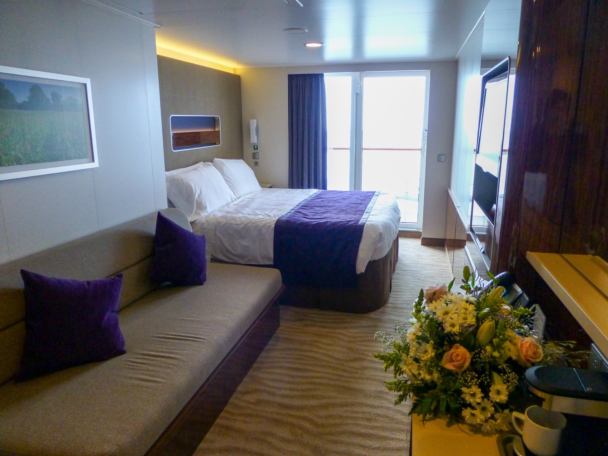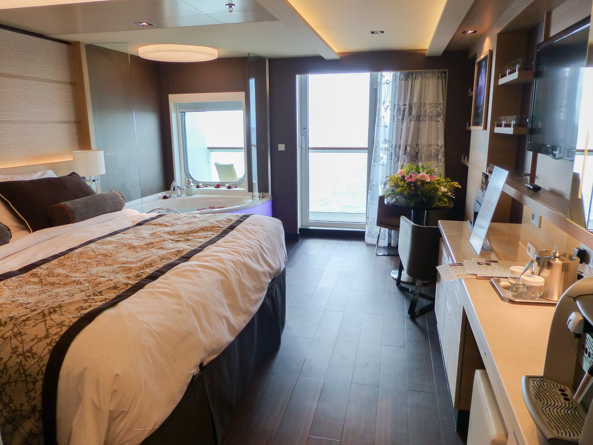 De meest luxueuze accommodatie is de Deluxe Owners Suite, waarvan er twee zijn aan boord. Je hebt op 70 m2 een woonkamer, master bedroom, luxe badkamer met bad aan het raam, en een mooi rond balkon.