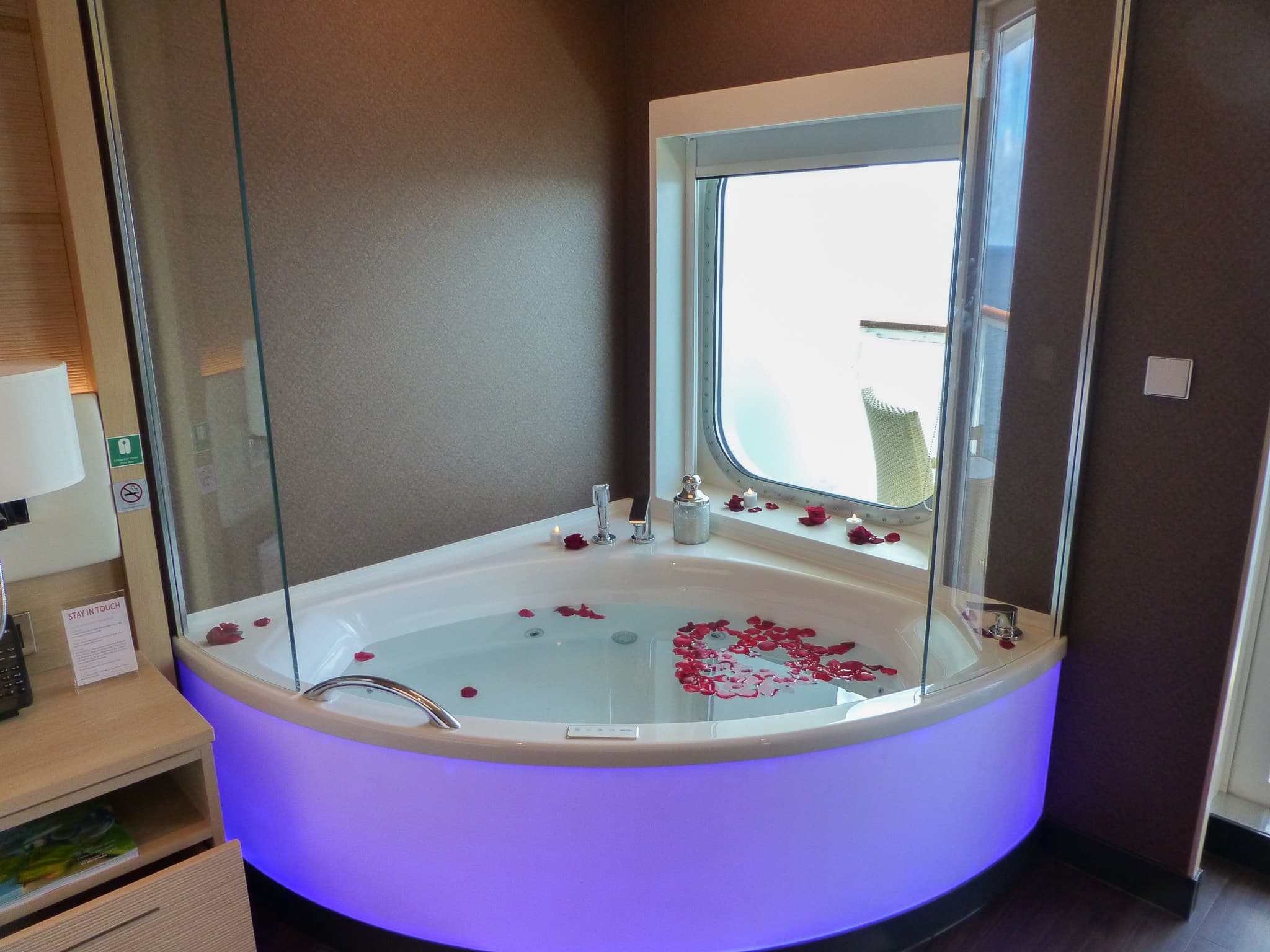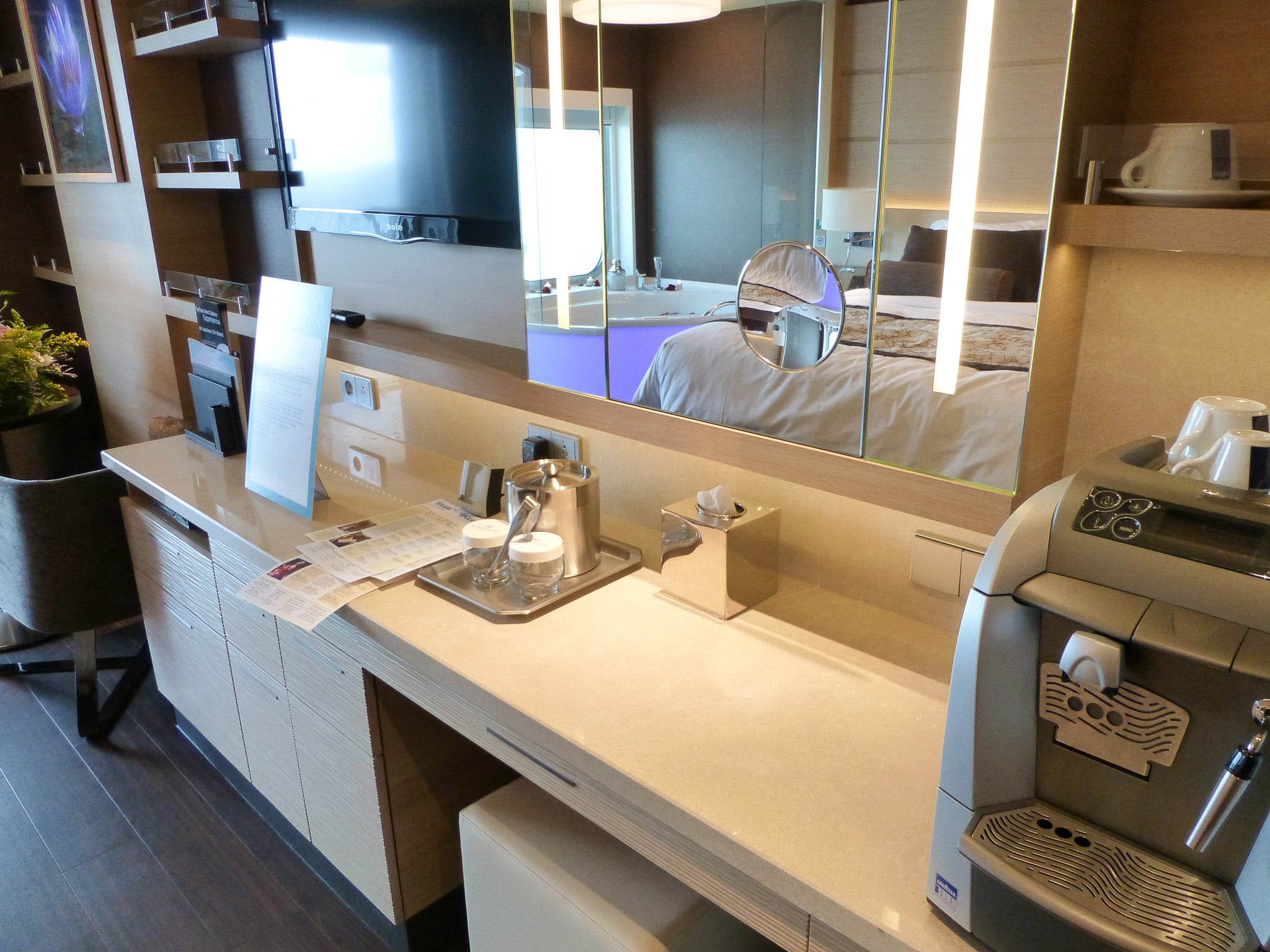 De Spa balkonhut en Club Balcony Mini Suites zien hetzelfde eruit. Ze hebben een lichter kleurgebruik in bijvoorbeeld de badkamer, deze is ook fijn ruimer als de standaard badkamer met een grotere douche en wasbak.