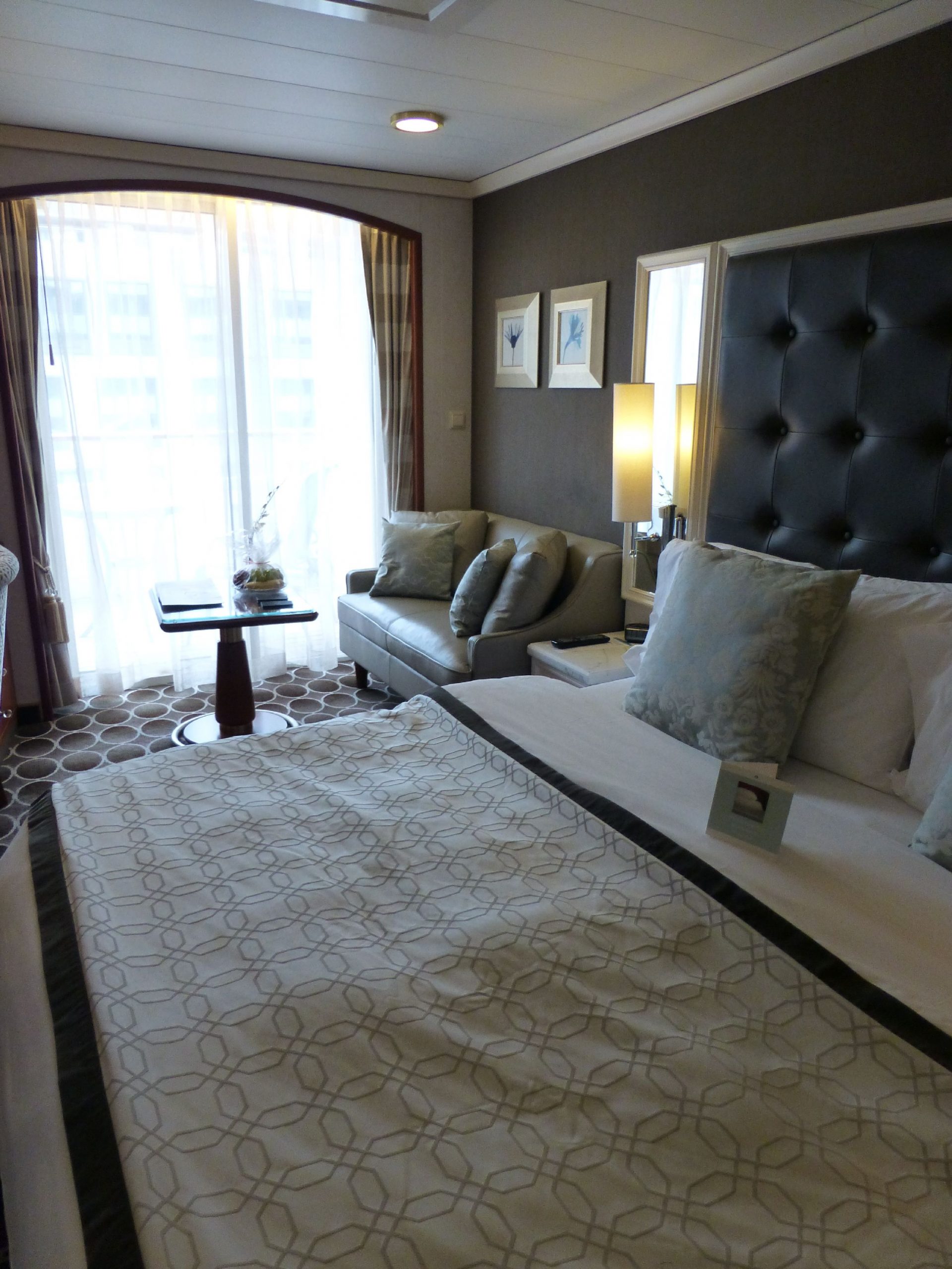De entree van het schip is het prachtige ruime atrium van twee dekken hoog. Hier voel je direct de ruimte die het schip biedt voor slechts 1070 passagiers en 655 personeelsleden. Rond het atrium zijn enkele winkeltjes, de receptie, een bar met de naam de Crystal Cove en een paar heerlijk ruime sofa’s. Wat opvalt is het plafond van het atrium. Glazen panelen in groen, blauw en lila aan het plafond zorgen voor een lichte sfeer.