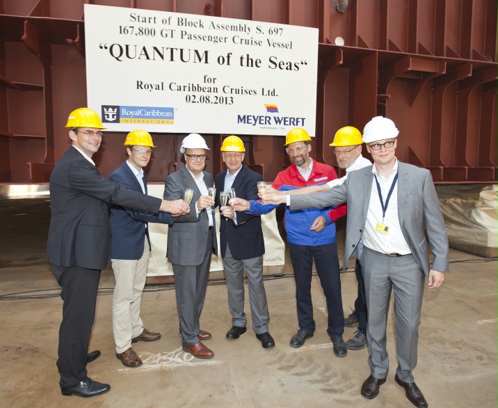 Vrijdag is in het overdekte bouwdok II van de Meyer Werft in Papenburg de kiel gelegd van de Quantum of the Seas met het plaatsen van een blok van 430 ton. De eerste mijlpaal in de bouw van het nieuwe cruiseschip van Royal Caribbean vond plaats tijdens een feestelijke bijeenkomst. Harri Kulovaara, Executive Vice President Maritime van Royal Caribbean International, legde daarbij de traditionele geluksmunt, waarna de blok op zijn plaats werd gezet. Er zullen nog in totaal 74 blokken volgen. De Quantum of the Seas is met 167.800 brutoton het grootste cruiseschip dat op de Duitse werf wordt gebouwd.