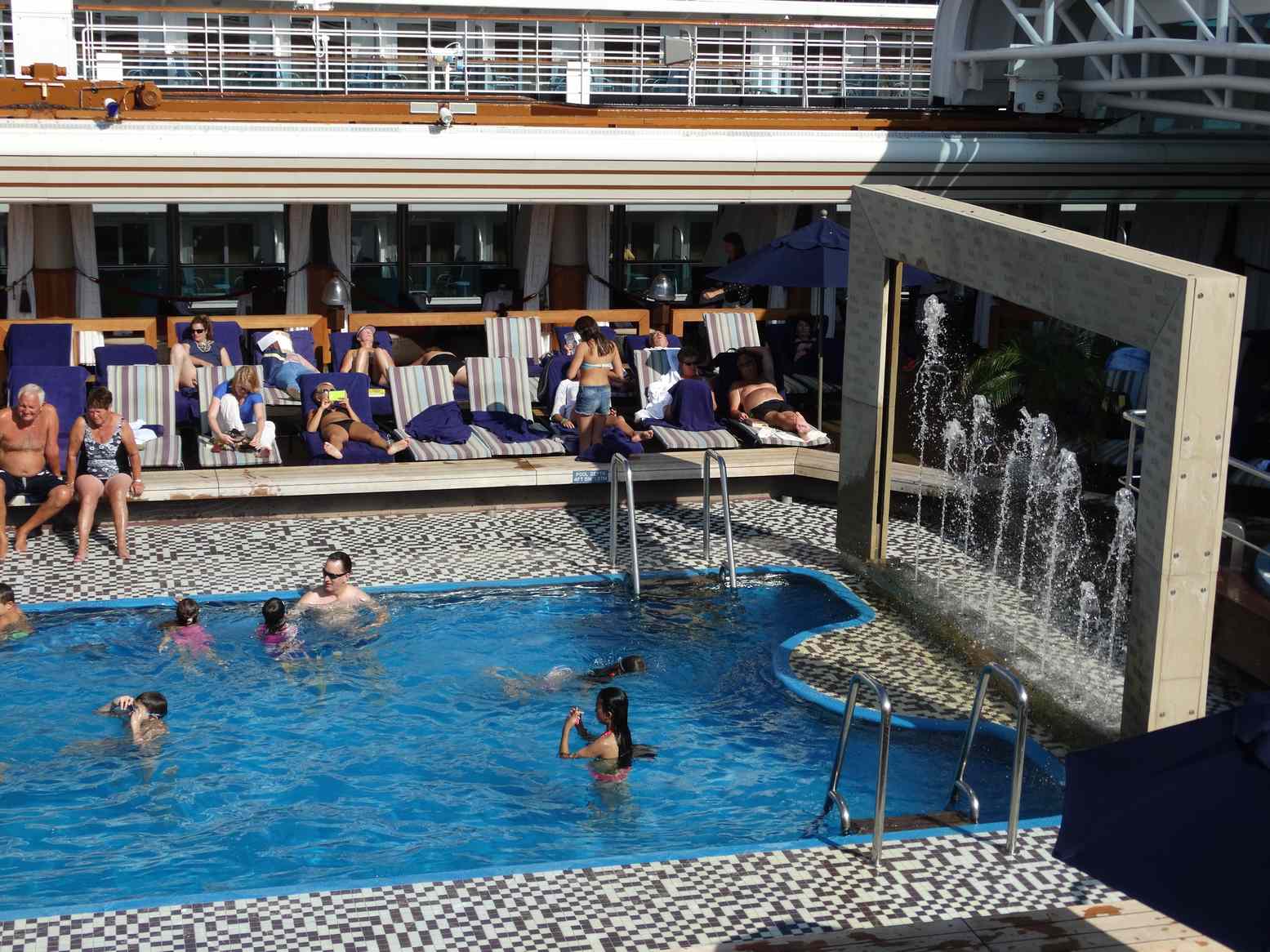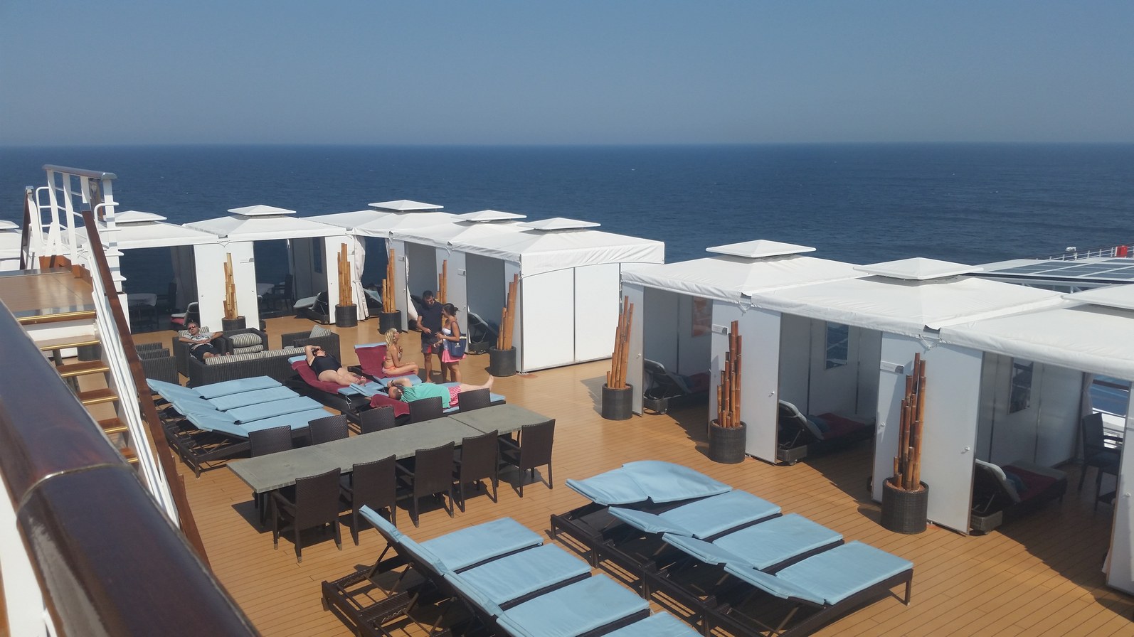 We hadden een kleine bries, felle zon en hoge temperaturen, zodat velen op de buitendekken te vinden waren. Gelukkig had ik zo een zonbedje te pakken (meer dan genoeg aanwezig!) en liet ik me een uurtje door de zon verwennen. Voor de liefhebbers is het mogelijk om een cabana te huren, of bij het lidozwembad (met uitschuifbaar dak) of op een dek hoger. Een tip voor een echt zonnige dag en je echt verwend wilt worden 🙂