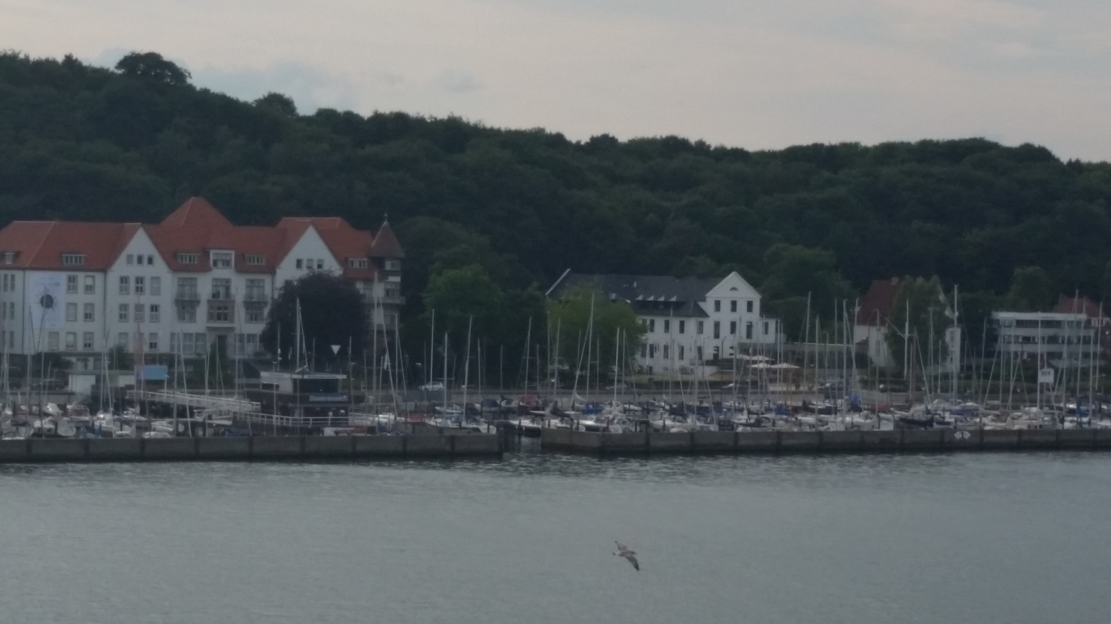 Al fietsend langs kanaal van Kiel maken we kennis met de stad en de haven. Al snel komen we een marine-centrum tegen van de universiteit van Kiel waar twee bassins zijn met zeehondjes. Grappig om ze te zien rondzwemmen en enthousiast reageren op die vreemde fietsers. Halverwege nemen we de gratis veerpont over het kanaal. Deze veerponten zijn sinds de bouw van het Kieler kanaal gratis voor iedereen zodat alle mensen de mogelijkheid hadden het kanaal over te steken. Halverwege stoppen we voor een Kaffee mit Kuchen (koffie met gebak) bij een kade vol met zeiljachten. We blijven een half uur zitten om te genieten van het mooie weer en de Kuchen. Terug gaat het via een immens hoge brug, waarbij de een na de ander toch maar wandelend met de fiets aan de hand zich naar boven werkt. Ik ook!