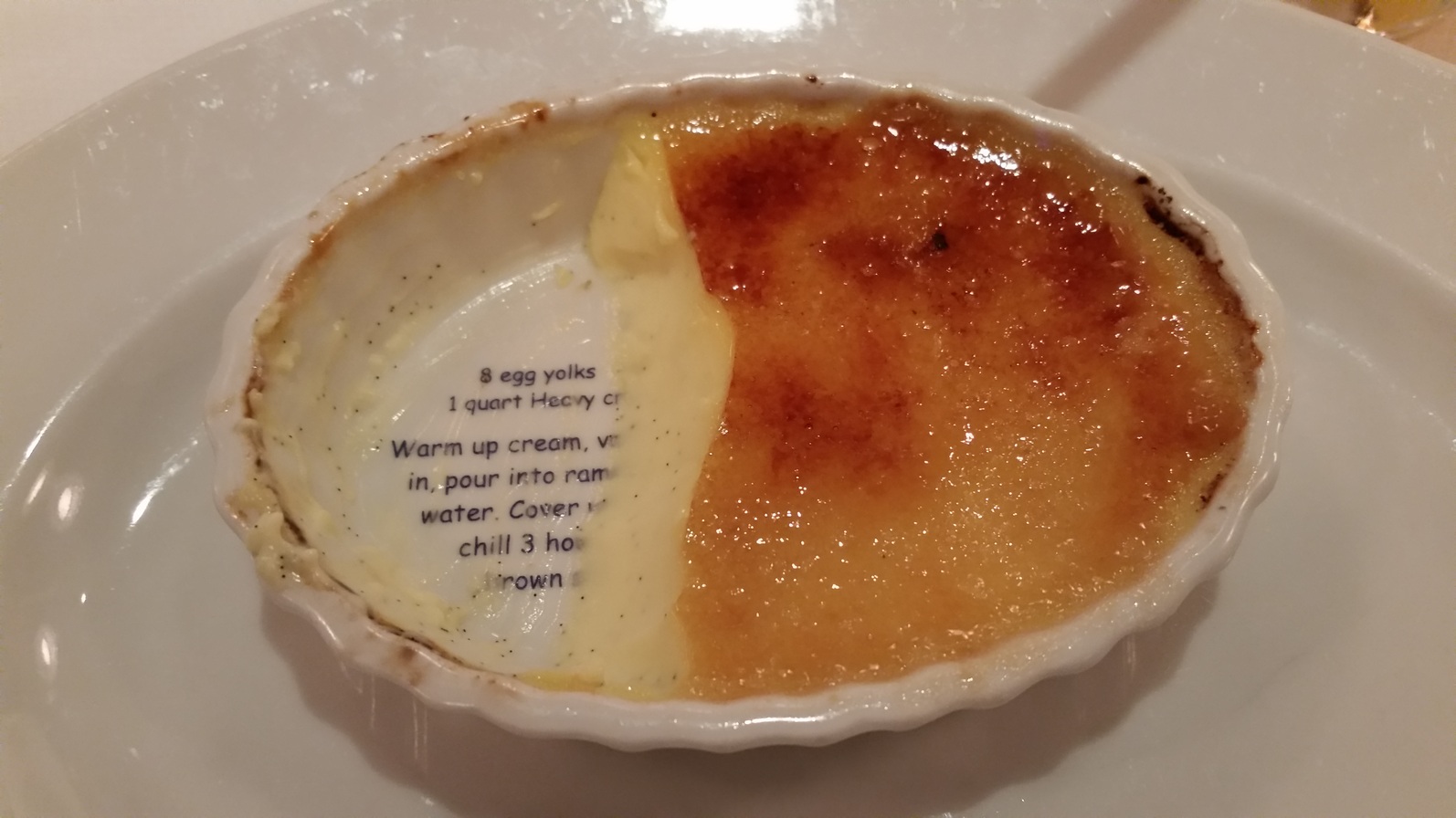 Sirio Maccioni is het brein achter het restaurant dat al sinds 1974 in New York bestaat. In een intensieve samenwerking met de chefkok zelf, genieten gasten in het soort van pop up restaurant in de Pinnacle Grill: prachtig servies, schilderijen van de maître en een speciaal samengesteld menu. Mijn keuze bestond uit een kleurrijke lobster salade, de zeer smaakvolle butternut squash soup (de topper van de gehele cruise!), een prima gegaarde Black Cod en een crème brulee met recept in het bakje zelf 🙂