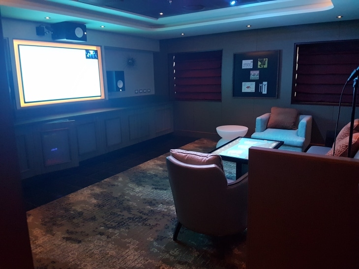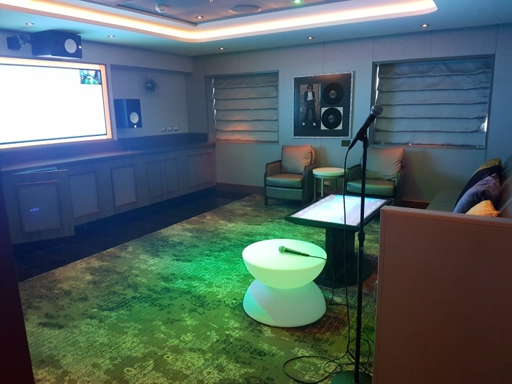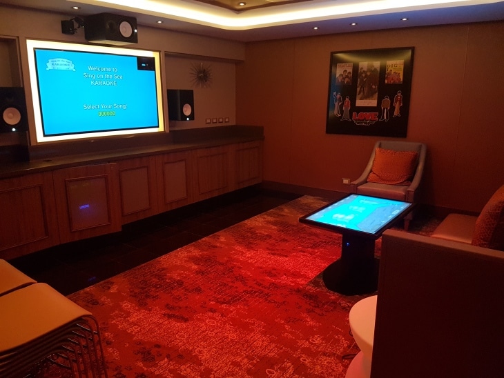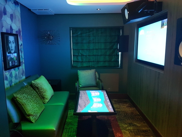– Aangezien karaoke bijzonder populair is in Azië zijn er 6 privé karaoke suites aan boord, elk met haar eigen modern kleurenpalet en thema-inrichting. Er kan gekozen worden uit een grote selectie van populaire nummers in China, de Verenigde Staten en Europa. Elke privé suite bevat comfortabele sofa’s, audio en videosystemen via grote televisieschermen en een eet- en drankservice (minibar). De suites zijn tijdens de maiden voyage al een grote hit.