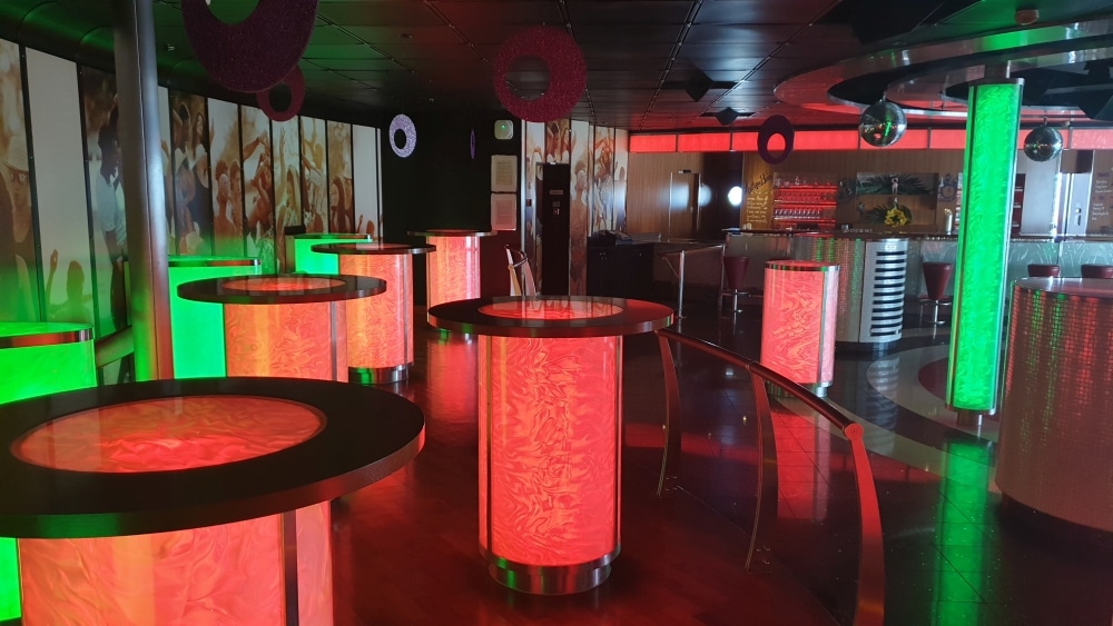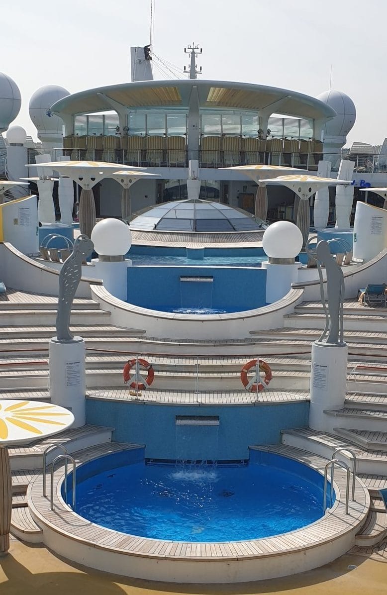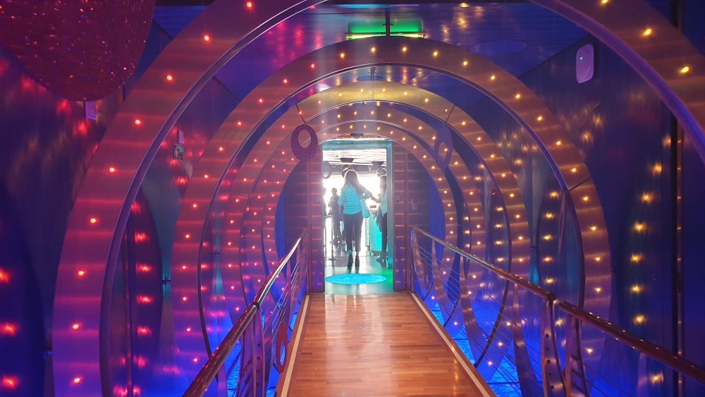 Vermaak vind je op verschillende plekken: uiteraard zijn er bovendek een aantal heerlijke plekken om af te koelen op een warme dag. Verschillende zwembaden, bars en sportvelden heb je buiten. ’s Avonds is de discotheek Anytime Bar open die je via een futuristische tunnel betreedt.
