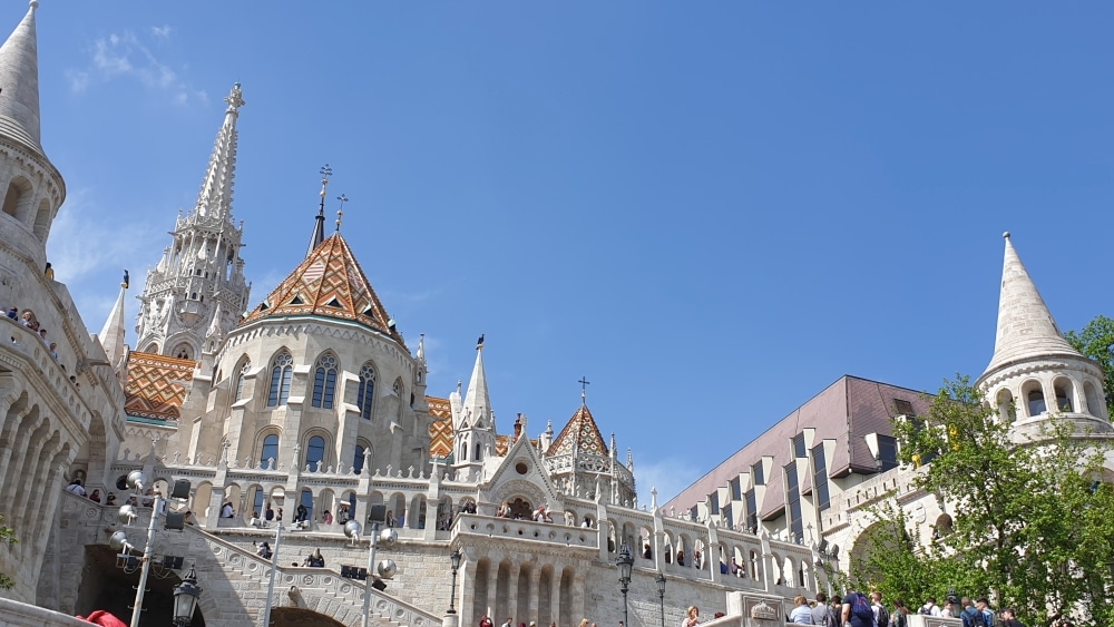 Het zou vandaag 27 graden worden, en dat was zichtbaar bij de excursies. De overgrote meerderheid koos voor het gemak van een bustour met een korte wandeling. Ik ging liever met de wandeltocht zonder bus. Met een klein groepje hebben we veel mooie plekjes van de stad gezien met gids Aniko. Van de indrukwekkende monumenten voor Joodse slachtoffers tot de IJzeren hangbrug en verder naar de Buda kant. Via trappen bereikten we het Visserspavillion en de kerk waar Sissi en Franz-Jozef gekroond zijn.