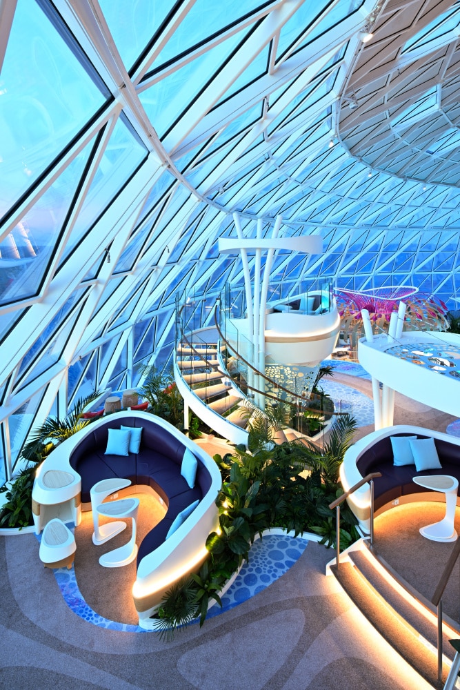 Aan boord zijn zoals we van de rederij kennen verschillende ‘buurten’ gecreëerd en op nieuwe plekken op het schip – in vergelijking met de Oasis-klasse – neergezet. Zo is er nu een familiegebied gemaakt, zijn er meer glijbanen en is de entree van de binnenpromenade een reusachtige bol.