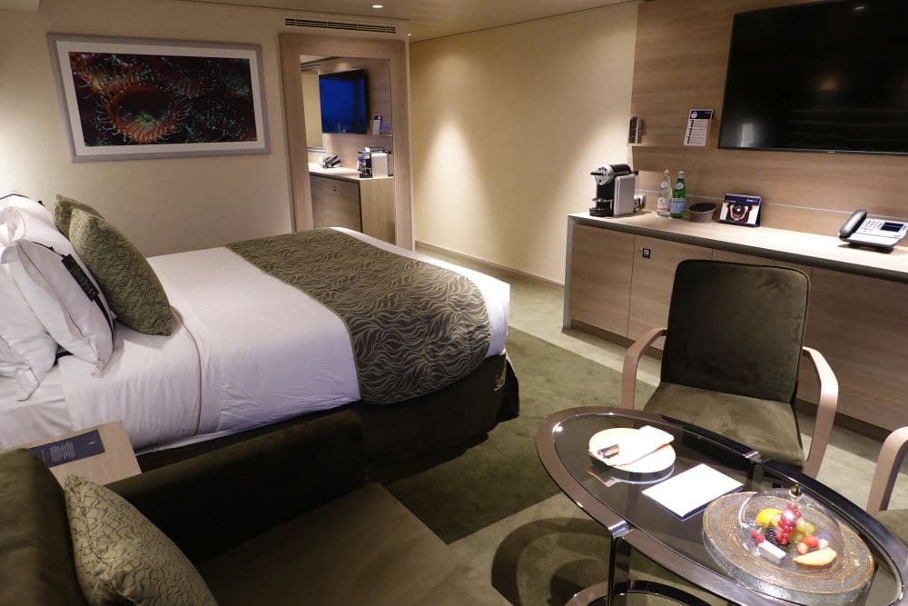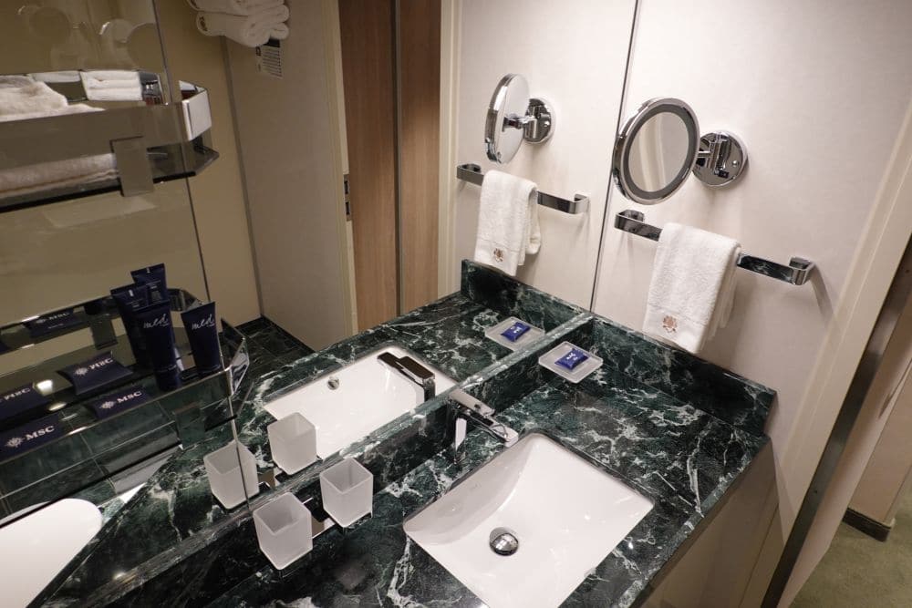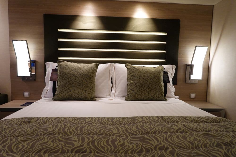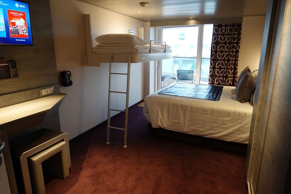 De MSC Grandiosa biedt 10 soorten hutten aan, waarvan Cruisereiziger zelf 9 soorten heeft kunnen bekijken voor je; een binnenhut studio & binnenhut, een buitenhut voor families, de balkonhut (3 typen), een Duplex Suite, de MSC Yacht Club Deluxe Suite en de MSC Yacht Club Royal Suite. Even wat indrukwekkende cijfers: de Grandiosa biedt in totaal 2421 kamers aan waarvan 64 een eigen whirlpool hebben 🙂 er zijn 8 hutten met twee verdiepingen, 160 buitenhutten, 755 binnenhutten, 1354 kamers met een balkon waaronder 190 familiehutten, 34 ‘gewone’ suites, 60 kamers voor mindervaliden in vrijwel iedere categorie en 95 suites in de MSC Yacht Club.