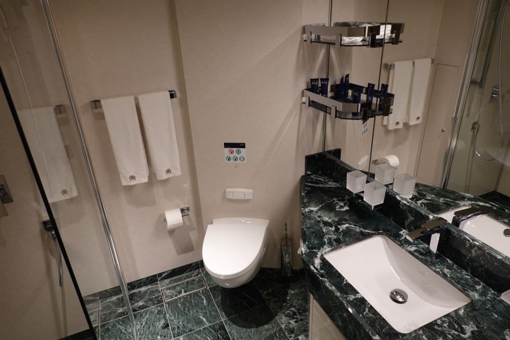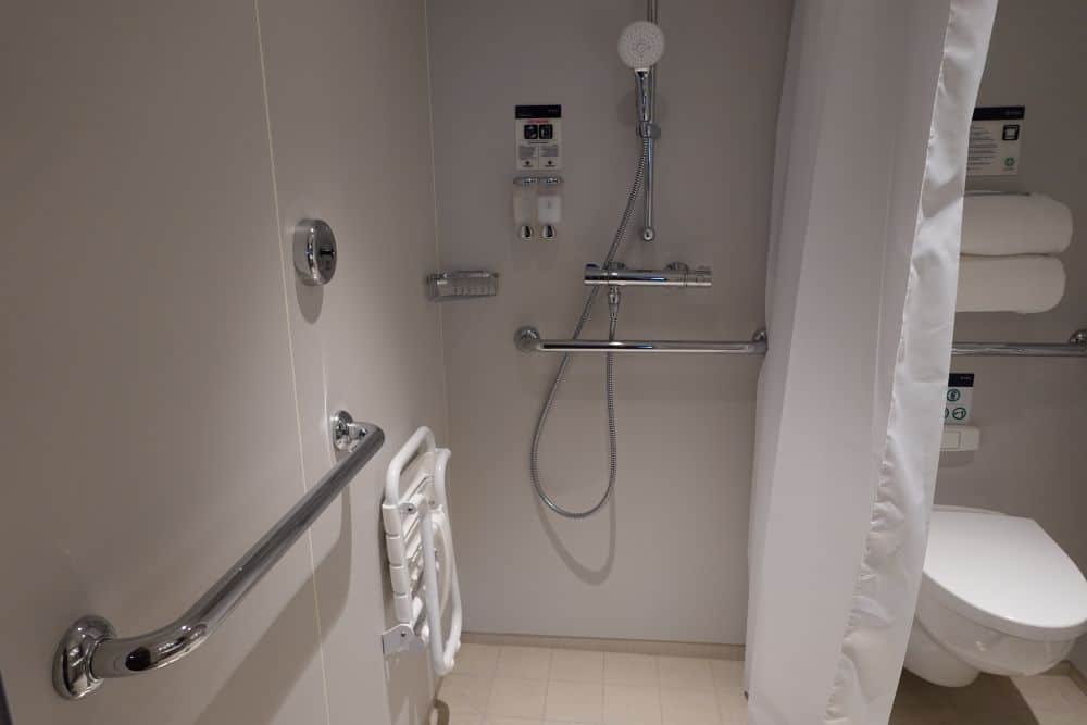 De balkonhut voor mindervaliden (32 stuks) is uiteraard ruim opgezet met een eveneens grote badkamer. Om het balkon te bereiken met een rolstoel is een plank beschikbaar. Het balkon die wij bezocht hebben, was enorm! Daar kan je gemakkelijk met je rolstoel op en ook nog ruimte hebben om te draaien. De badkamer is uiteraard aangepast. De badkamerdeur / kamerdeur gaan overigens niet automatisch open met een druk op de knop. De kledingkast heeft helaas geen hangrek die je naar beneden kunt trekken.