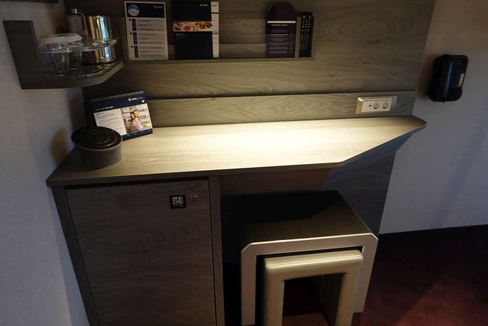 De kleurstelling van alle kamers op de MSC Grandiosa voelt, ten opzichte van bijvoorbeeld de MSC Bellissima (geel en donkerhout), toch weer wat donkerder aan. Net als op de MSC Meraviglia. Rood is de hoofdkleur op de Grandiosa. De bureau’s zijn wel iets lichter van kleur om beter bij het rood te passen. De gordijnen zijn speels rood met witte blaadjesfiguren. De luxere hutten zijn overigens juist van rood naar een groene kleur veranderd.