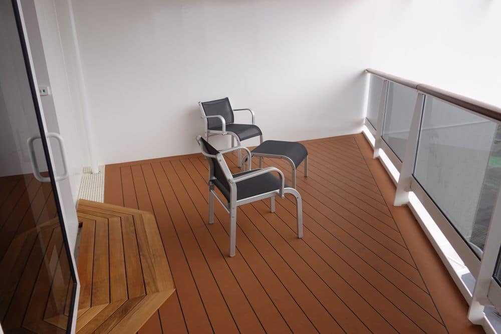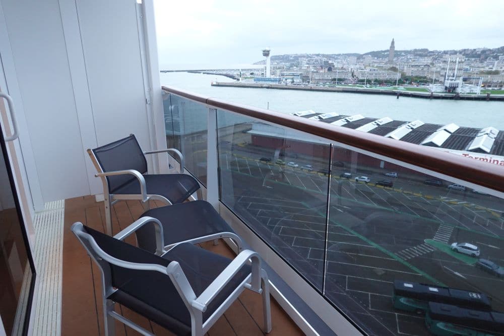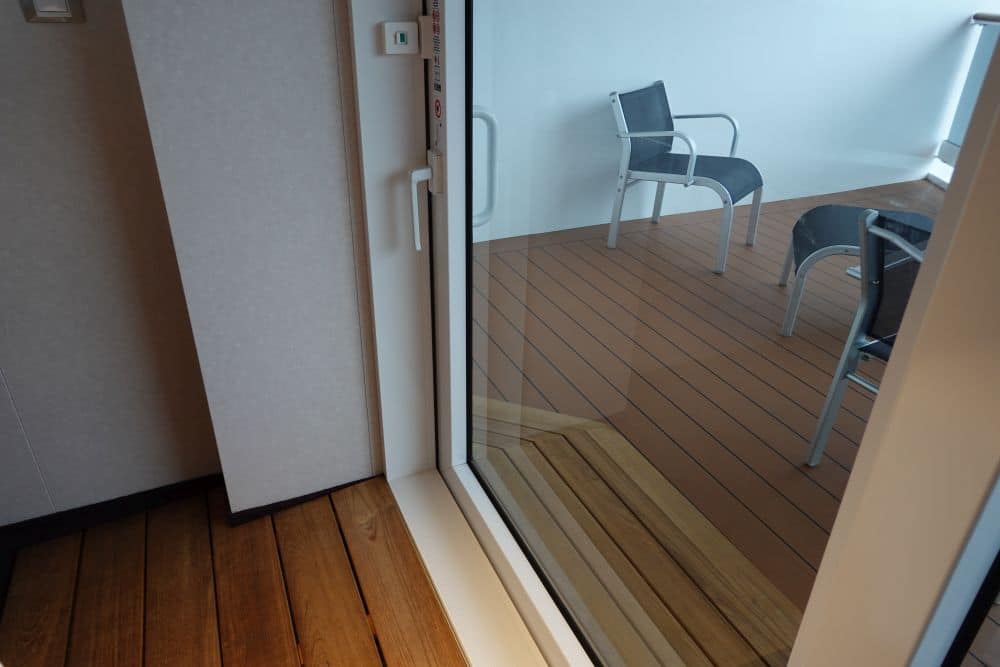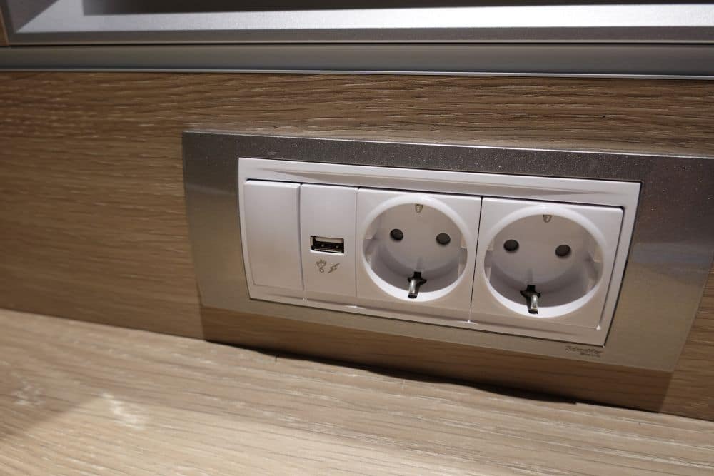 Bij dit bureau bevinden zich twee Europese – en twee Amerikaanse stopcontacten en een usb-poort, net even wat meer dan de binnenhutten. De kledingkast heeft een hanggedeelte en een aantal planken, twee lades (met twee strandlakens) en een kluisje. De opbergruimte is dus beperkt tot deze kast. In de badkamer zijn nog wel plankjes om je toiletspulletjes neer te leggen. Het balkon is niet heel diep.