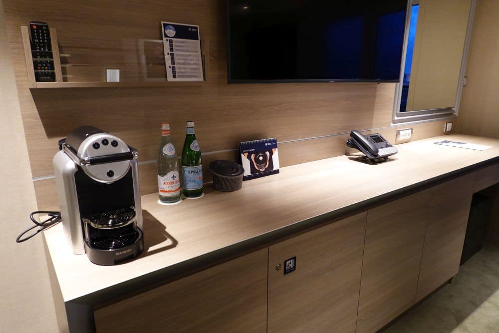 Tussen de 755 binnenhutten (inclusief 27 voor mindervaliden) bevinden zich 15 studio’s, kamers voor solo cruisereizigers. De 12 vierkante meter is zeer efficiënt ingericht in deze hut. Het bed van 1,40m breed staat tegen een lange kant aan. Elke hut op de MSC Grandiosa heeft ZOE overigens op het bureau staan, een digitale helpdesk-apparaat in 7 talen die je met allerlei vragen kunt helpen.