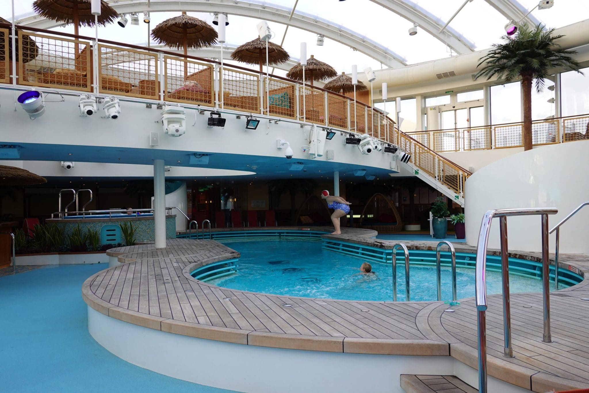 Het enige buitenzwembad van de AIDAnova bevindt zich redelijk vooraan op het schip, geflankeerd door een dame in het rood en een heer in het blauw. Je kunt geheel rondom lopen op dit dek en je plekje uitzoeken bijvoorbeeld dicht bij een whirlpool of de bar. Gasten in een suite hebben een eigen, hoger gelegen dekgedeelte met loungebedden.