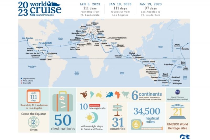 De cruise start Noord-Amerika, de 111-daagse vanuit Fort Lauderdale en de iets verkorte (97-daagse cruise) vanuit Los Angeles. Gasten ontdekken met de Island Princess 50 bestemmingen in 31 landen op 6 continenten: Afrika, Azië, Australië, Europa, Zuid-Amerika en Noord-Amerika.