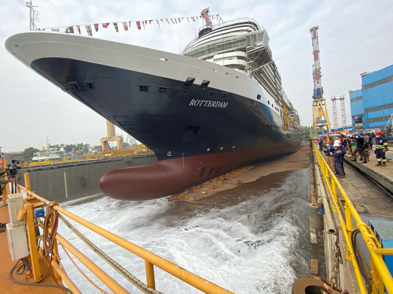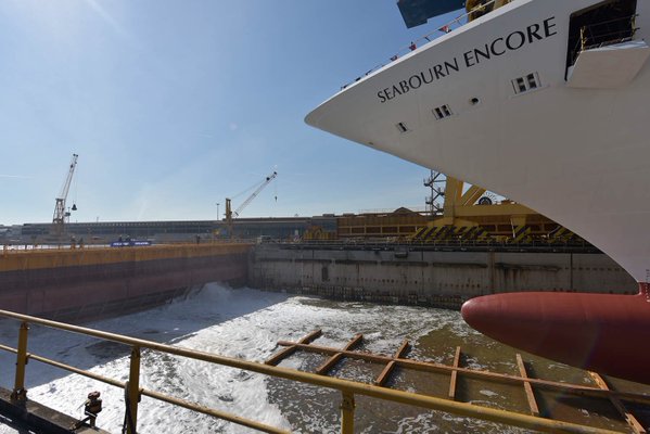 De eerste tewaterlating is een fotogeniek moment! Wanneer het schip voor het eerst water raakt, spreekt men van de eerste tewaterlating. Dit werd en wordt gedaan door het schip in het water te laten rollen of water in een dok te laten stromen. Bij kleine expeditieschepen zie je dat deze echt nog van een helling afrollen. Bij de grote cruiseschepen, stroomt bij scheepswerven van Fincantieri, STX en Meyer water in de bouwhal of het droogdok. Het vullen van een bassin duurt zeker 2 dagen.