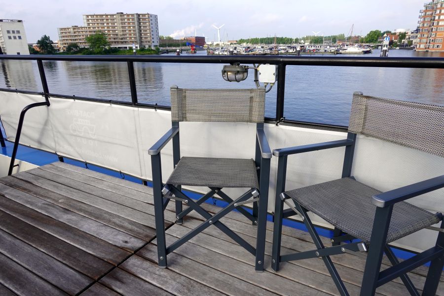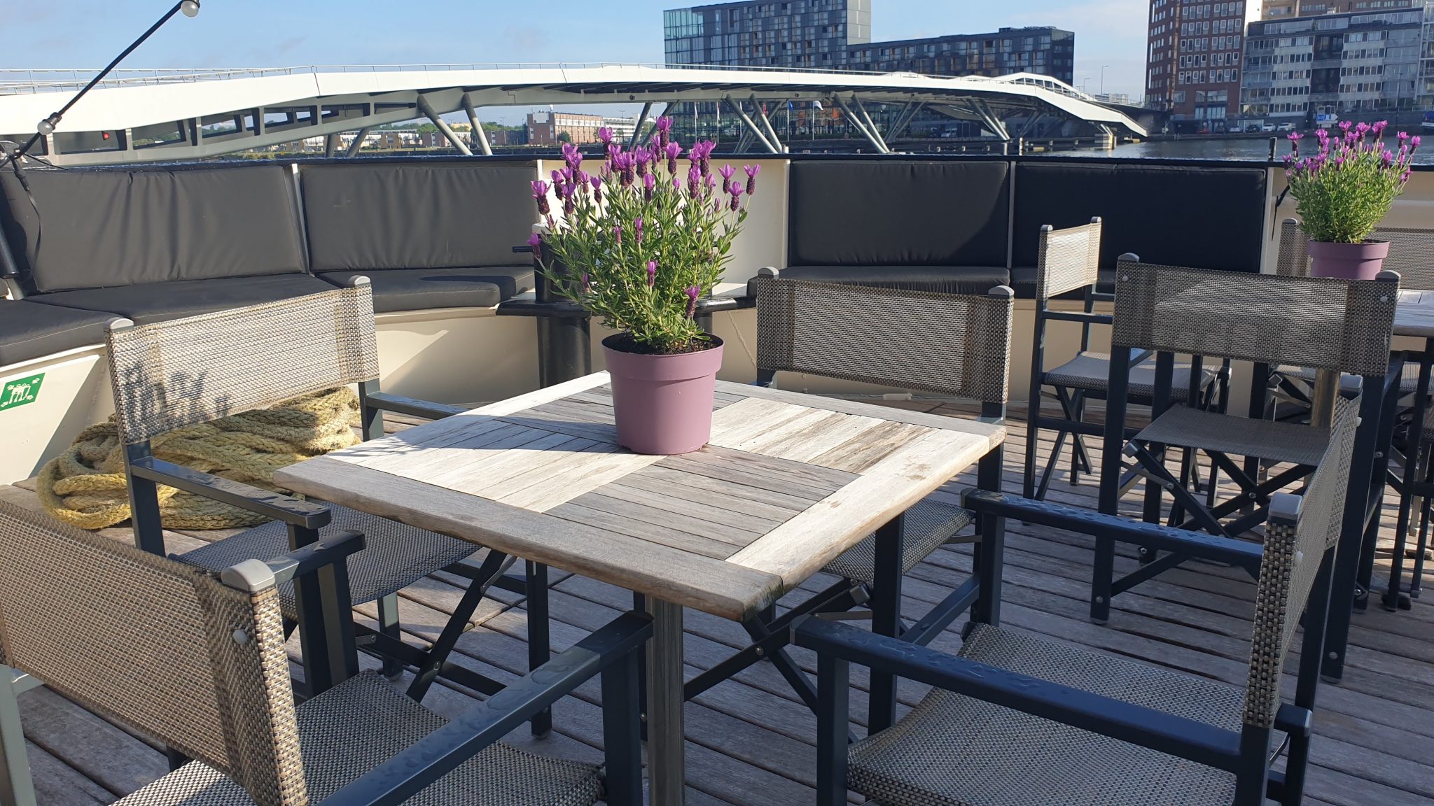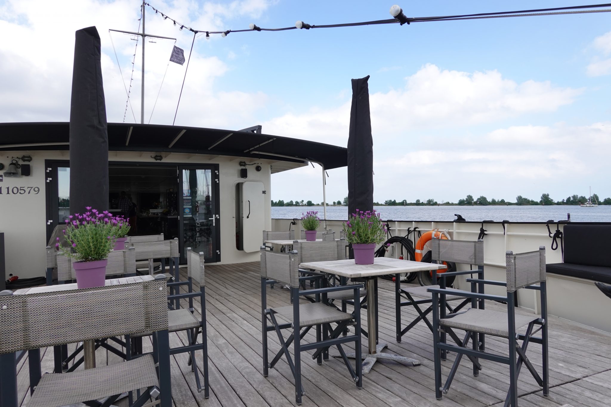 Voor een drankje in de zon na een dag fietsen ga je naar het achterdek; een heerlijke plek om een koffie te drinken, te loungen of ’s avonds met kaarslicht na te praten.
