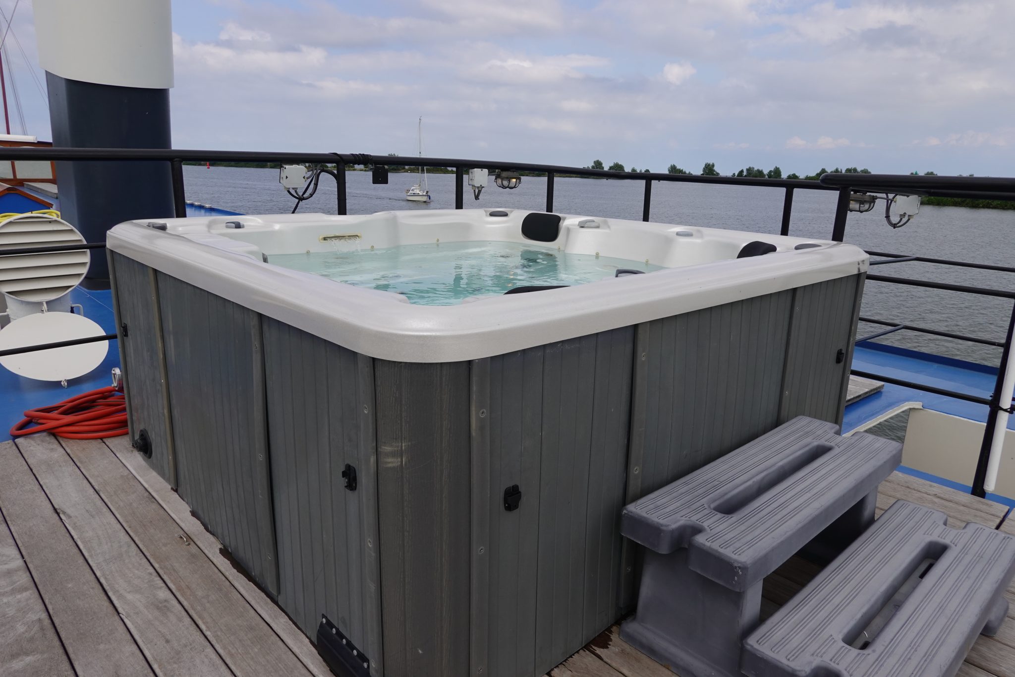 Een bubbelbad met ligbedden ligt op het hoogste dek. Neem gerust een warm bubbelbad na een fietstocht, want je mag er altijd in!