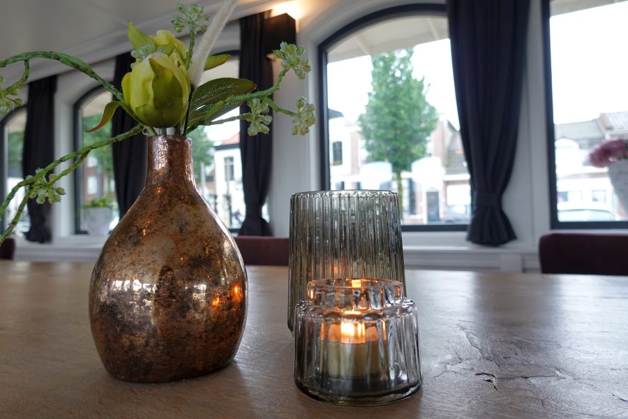 Het restaurantgedeelte omvat vier grote sfeervolle tafels met daarbij een buffet. Gasten kunnen hier zelf ontbijt pakken (in coronatijd wordt het uitgeserveerd) en koffie/thee. Het diner vindt in coronatijd op gepaste afstand van elkaar plaats. Omdat er slechts 16 gasten zijn, past het precies. Bij meer personen zal het diner in twee zittingen worden opgedeeld.