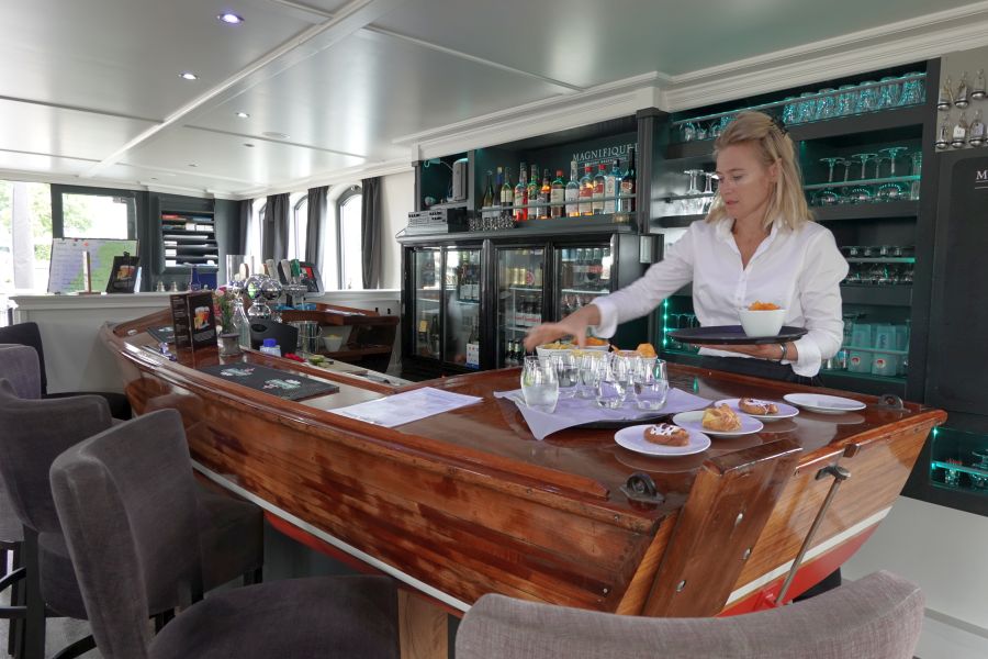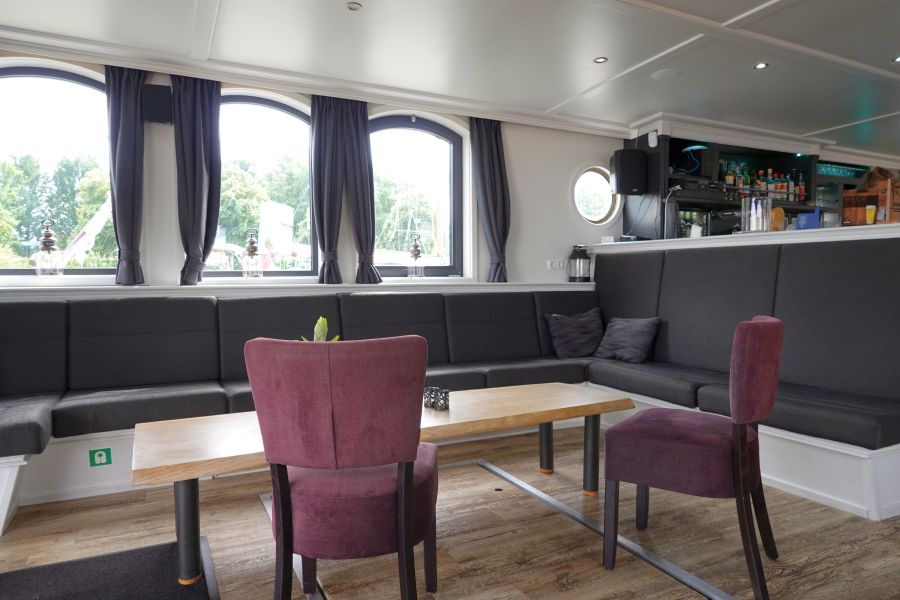 De lounge is de plek waar je gedurende de hele dag door even kunt zitten en napraten. De bar, toepasselijk een sloep, biedt je allerlei drankjes, van lokale bieren waar het schip langs vaart tot softdrinks en wijnen van kleine chateaus. In de namiddag zijn er na de fietstocht lekkernijen en een hapje voor bij het drankje.