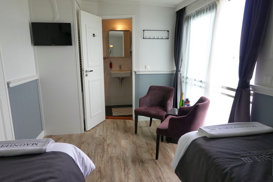De suites liggen op het bovendek, op dezelfde hoogte als het restaurantgedeelte lounge en buitenterras. De Magnifique III heeft vijf suites die allemaal een frans balkon met schuifdeur hebben. Ze zijn afgezien van de grootte, qua kleuren identiek aan de tweepersoonshutten. Extra is een zitje, twee stoelen en een tafeltje. Hieronder zie je een opstelling met twee losse bedden en twee bedden naast elkaar.