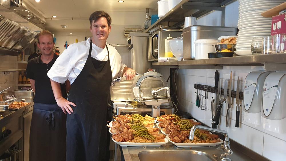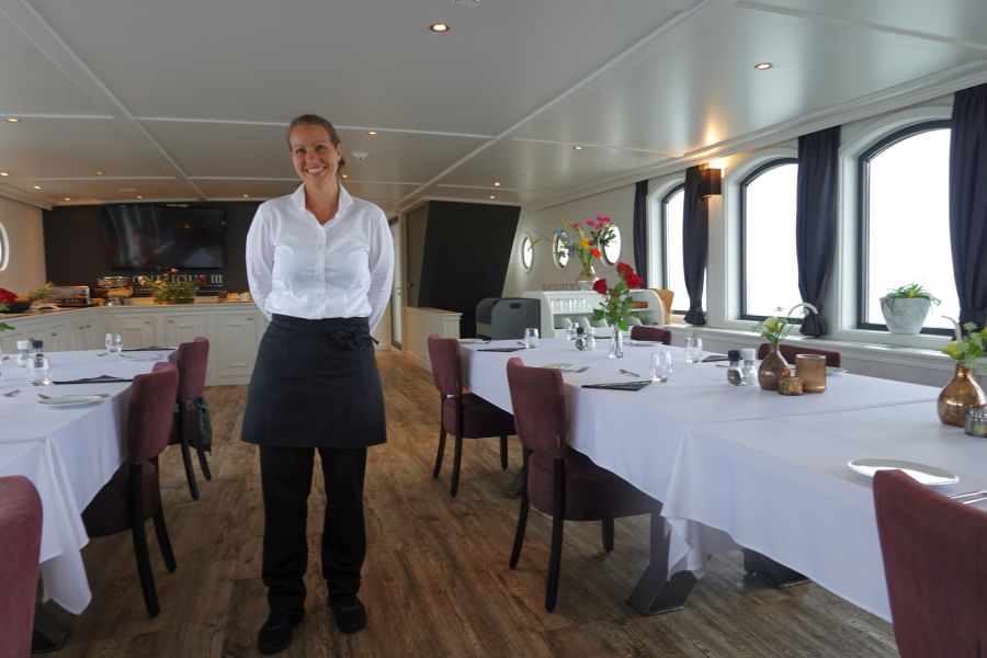 Ondertussen is het dinertijd geworden en zijn de tafels keurig opgedekt. Kok Rutger kondigt elke avond aan wat het diner brengt. Dit is een vaststaand menu van minimaal 3 gangen. Ik mag even in de keuken kijken om te zien hoe Rutger het iedere avond klaarspeelt. Matroos Thomas helpt waar nodig en de gastdames Ingeborg en Annika serveren het in een razend tempo uit. Met Rutger had ik eerder een ontzettend leuk gesprek over het werken in de kombuis aan boord van een schip.