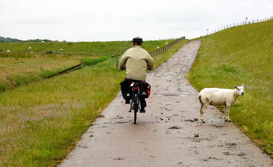 Texel is natuurlijk het eiland van de schapen! We merken dat al snel; we rijden bewust een stuk onderaan de dijk om de schaapjes tegen te komen. Over de wildroosters zien we een bord met Eigen risico. Dat durven we wel aan. Het pad is behoorlijk smerig van de uitwerpselen van de schapen, maar het is een belevenis om tussen de schapen te rijden. De meesten zien ons aankomen en gaan dan netjes uit de weg.