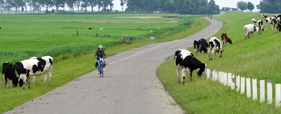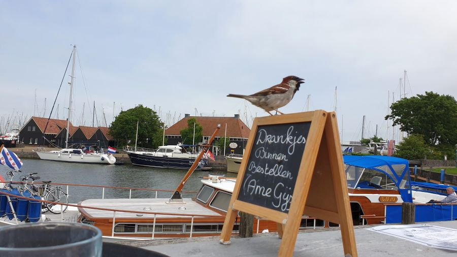 We gaan gestaag en besluiten toch de lange route te fietsen, een omweg naar Workum door de weilanden en wederom prachtige dorpjes. Workum is met recht een mooi stadje te noemen. Statige gebouwen en gezellige terrassen. We blijven niet al te lang hangen en fietsen door naar Hindeloopen. Wat een verrassing is Hindeloopen! We stappen af en lopen met onze fiets door het dorp met nauwe straatjes en lopen langs het Schaatsenmuseum. Bij de jachthaven zijn cafe’s geopend en zittend op de kademuur genieten we van de bedrijvigheid. Zelfs de sluis wordt (handmatig!) opengedraaid voor een bootje. Na Hindeloopen rest eigenlijk alleen nog de terugweg, onder de dijk langs, met wederom veel veel tegenwind. Mede-reisgenoten zonder e-bike komen we lopend tegen; zij hebben het fietsen – voor even – opgegeven!