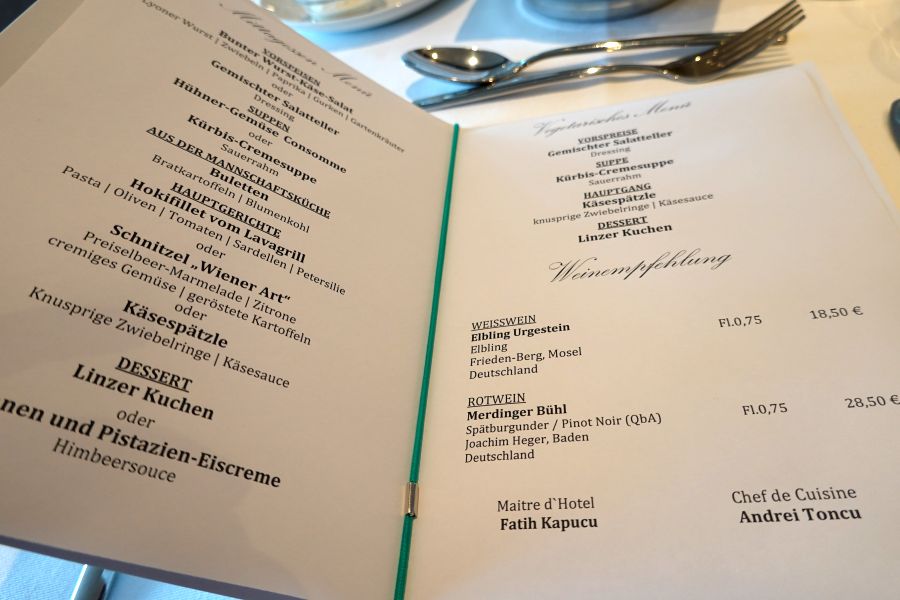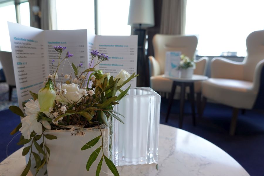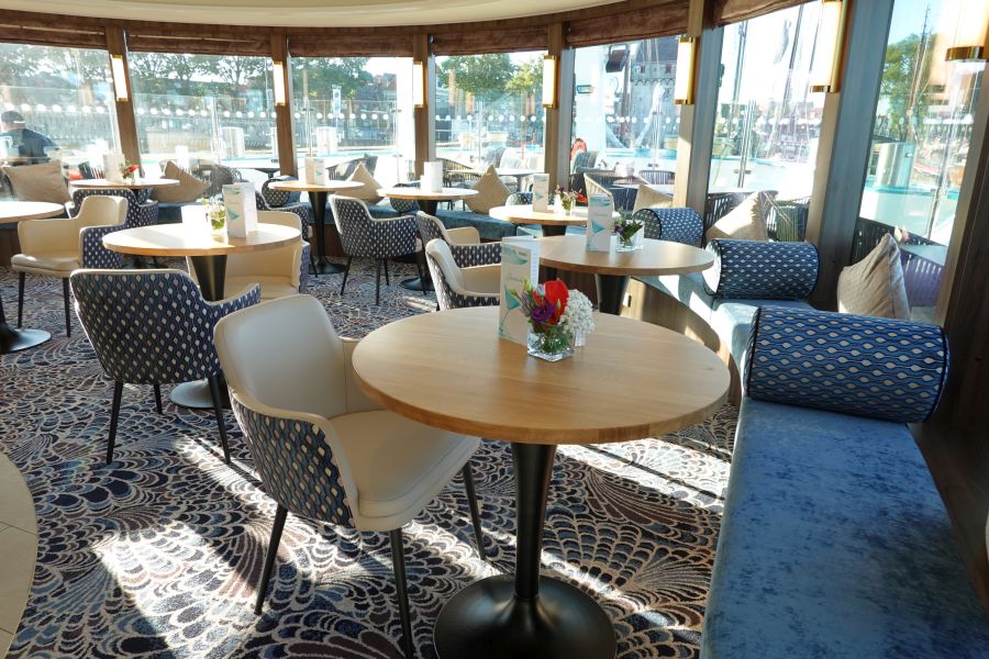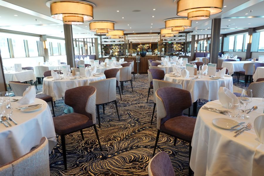 Het hoofdrestaurant Vier Jahreszeiten (Vier jaargetijden) bevindt zich op het onderste dek. Vanwege de COVID-19 pandemie werden het ontbijt, lunch en diner uitgeserveerd. Je zit in het restaurant altijd op dezelfde plek. Het tweede restaurant is het Lido-restaurant op dek 3 aan de achterkant; een klein restaurant met showcooking. Tijdens mijn cruise was dit restaurant gesloten.Buitendekken