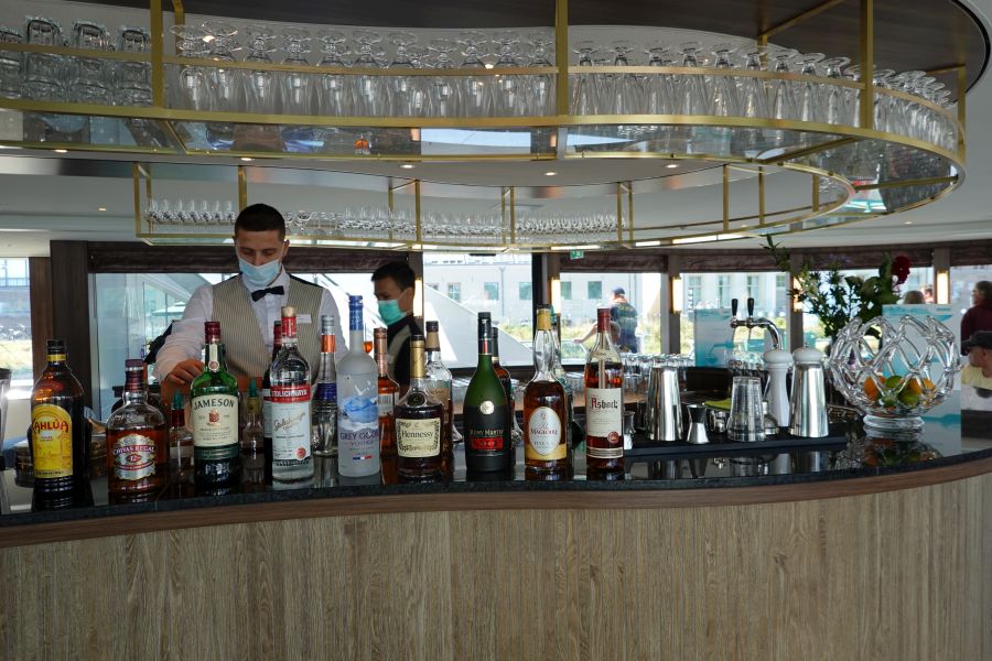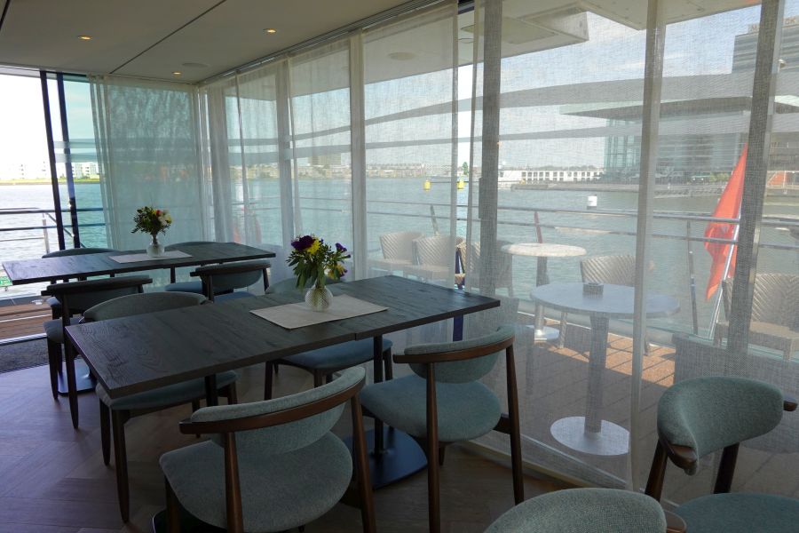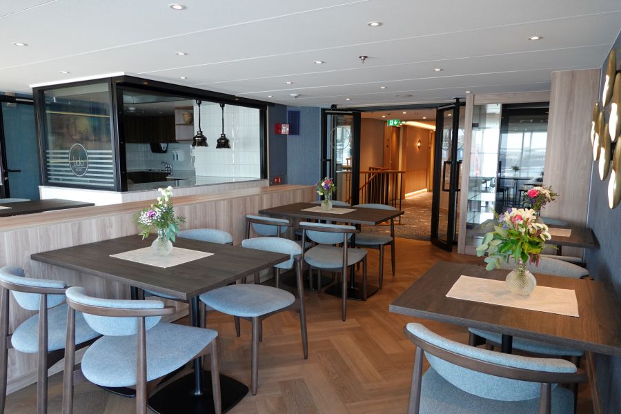 Op de Annika kom je binnen in een ruime hal. Je vindt hier de receptie, winkeltje en desk van de cruisedirector, op mijn reis zelfs 2 cruisedirectors! Vanwege COVID-19 heeft Phoenix Reisen nog niet alle zeecruiseschepen ingezet en zijn dus niet alle cruisedirectors aan het werk. Om de riviercruises in goede banen te leiden, met extra werkzaamheden vanwege de gezondheidscontroles (metingen), heeft de Phoenix Reisen op de Annika daarom twee cruisedirectors, Manuela en Carola. In de hal is bovendien een lift aanwezig die alle binnendekken met elkaar verbindt. Deze gaat dus niet naar het zonnedek. In de lounge kan je overdag een drankje bestellen (niet in de prijs inbegrepen), wordt een bouillon (wel inclusief) geserveerd aan het einde van de ochtend en staat rond 4 uur Kaffee und Kuchen (inclusief) voor alle gasten klaar. De mooiste plek is vooraan in de lounge, bij de bar, waar je een prachtig uitzicht hebt bij het varen.Restaurants