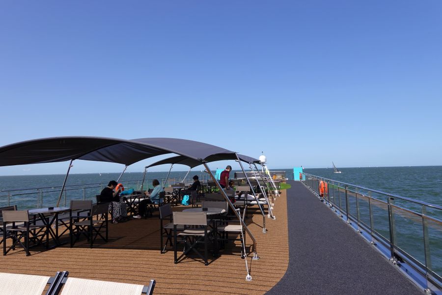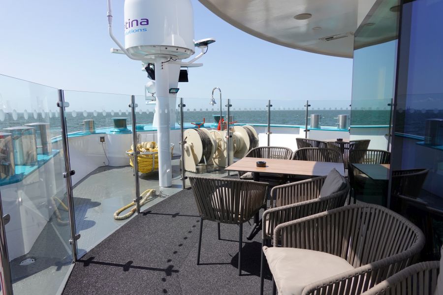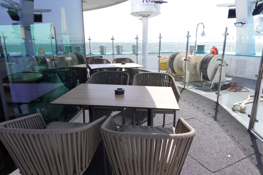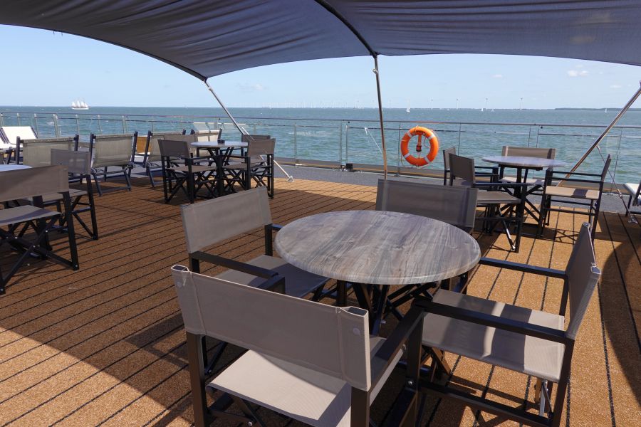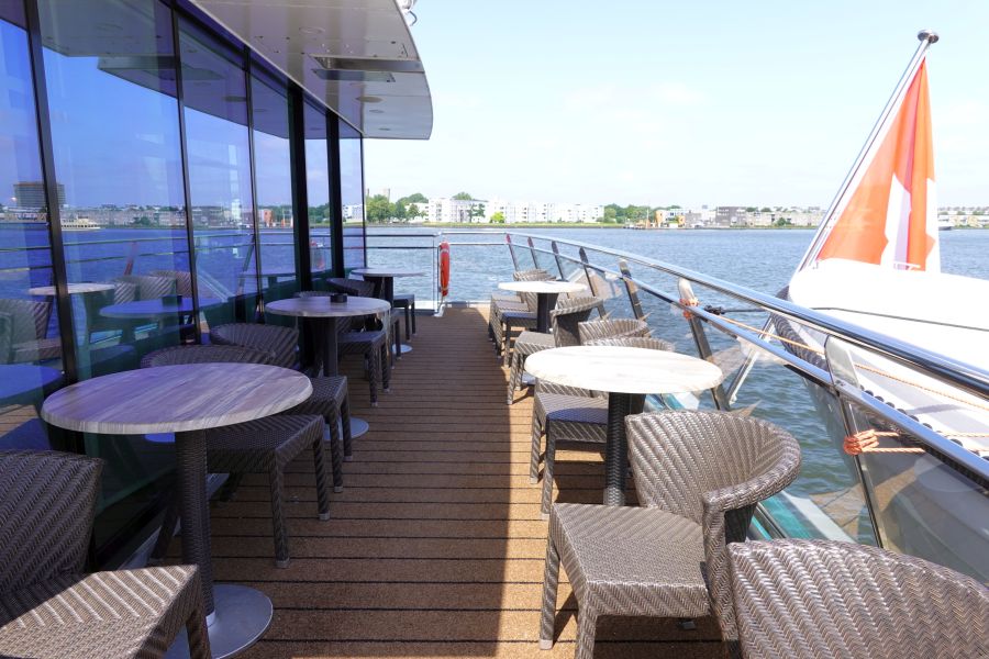 Tot slot neem ik je mee over de buitendekken: te vinden bij de lounge en het zonnedek. Op het zonnedek vind je bij het varen de beste en mooiste uitzichten. Je kunt zelfs genieten van een warm zwembadje. Overigens kan je binnen op het onderste dek ook genieten van de Fitness, kapper of sauna. Deze moet je wel vooraf even reserveren. Aan de voorkant van het schip zijn loungebanken en andere heerlijke plekjes om te zitten. Roken mag overigens alleen op de buitendekken, buitenom bij de lounge staan bijvoorbeeld een aantal zitjes. En een gouden tip: aan de achterkant van het schip, 1 verdieping lager, is een klein buitendek waar je ook heerlijk rustig kunt zitten. Deze zit bij het Lido-restaurant en is vrij toegankelijk.Lees alles: