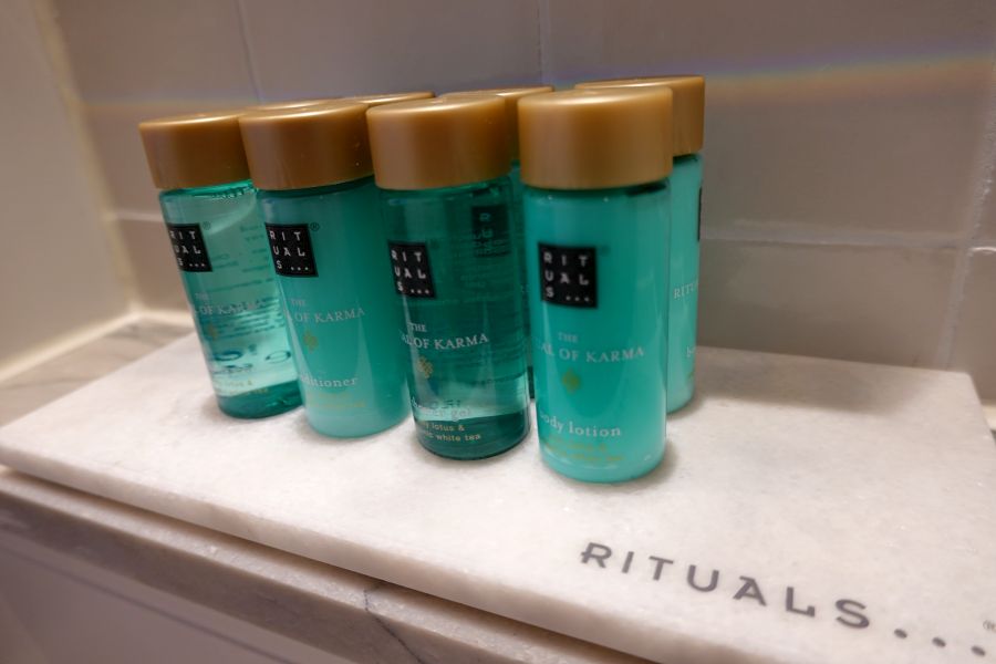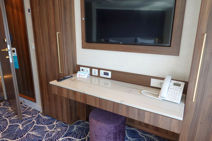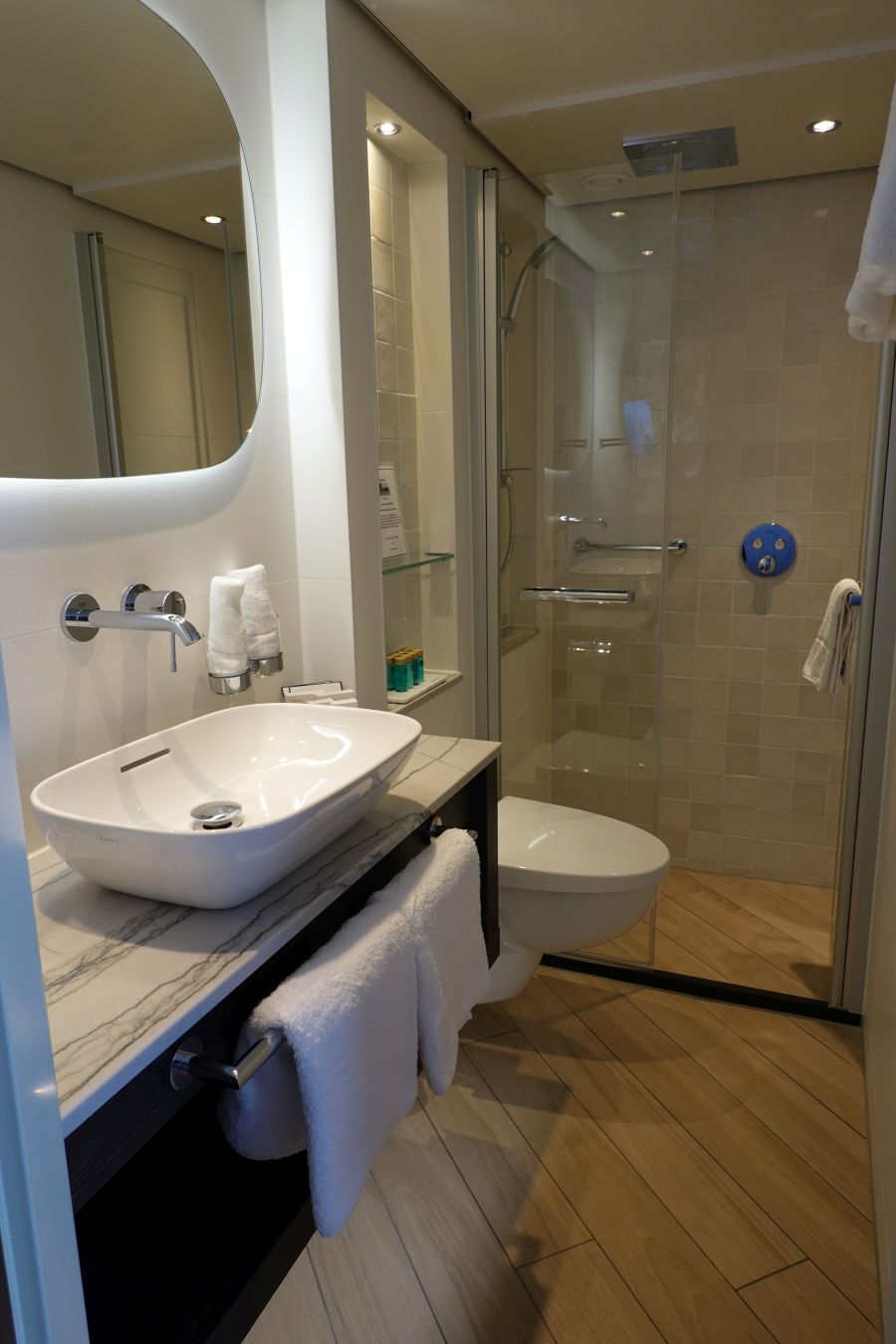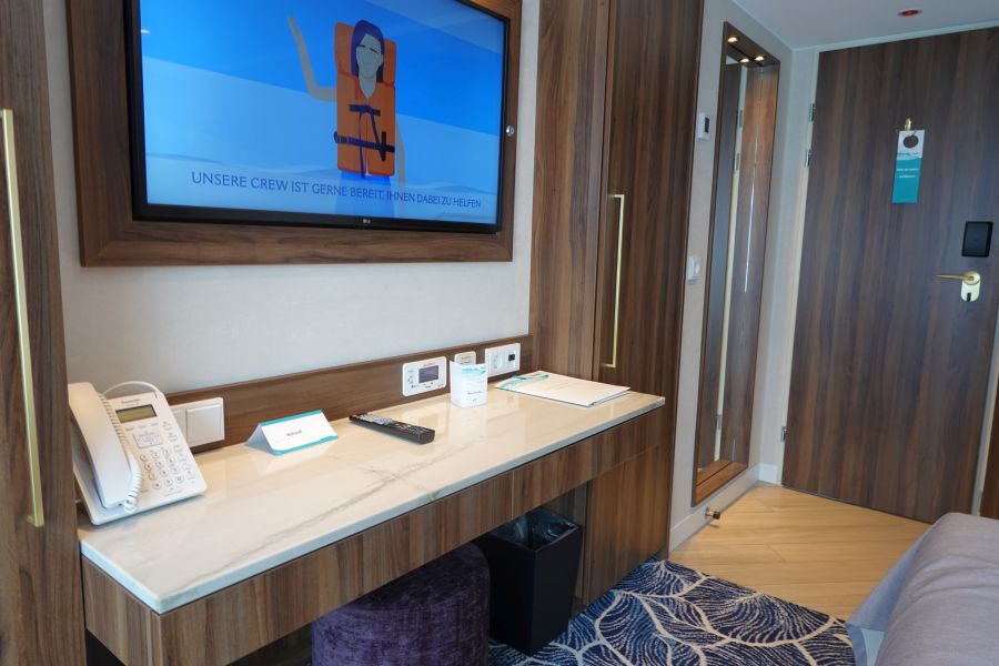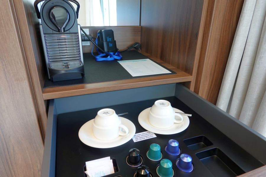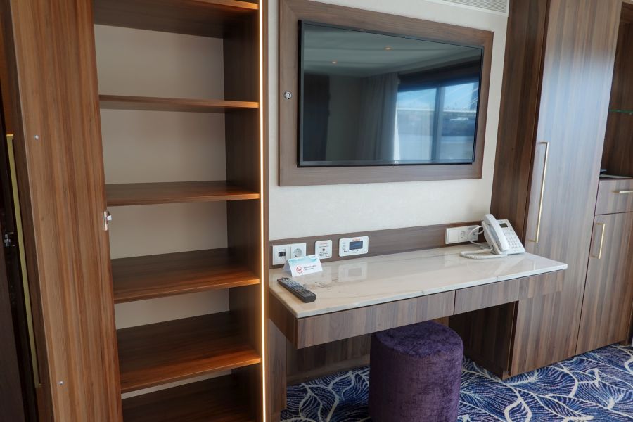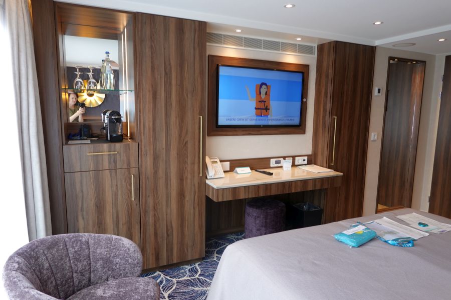 Mijn kamer (317) lag op het hoofddek, het Orion dek, halverwege de gang en dichtbij de trap naar het zonnedek. Wat ik persoonlijk echt heerlijk vond! Je staat vanaf deze kamer zo op het zonnedek. De erg ruime kamer is ingericht in de moderne kleuren blauw en lila. Donkerhout en goudkleurige elementen omlijsten het geheel. Werkelijk een prachtige kamer! Onder het bed kan je fijn je koffer kwijt! Naast het bed staan aan weerszijden ladekastjes, met op één een wekkerradio dat ook functioneert als draadloze oplader voor je telefoon. Je legt hem erop en je telefoon wordt opgeladen. Aan de overzijde van het bed staat een indrukwekkende kastenwand met o.a kluisje, nespresso apparaat en koelkast. Voor je kleding zijn er een ruime hang- en legkasten. Bij het bureau vind je een poef, twee lades, 2 usb aansluitingen en stopcontacten. Bovendien kan je hier het luidsprekersysteem aan of uit of harder/zachter zetten. In de kast vind je bovendien ook een badjas om te gebruiken aan boord. De eerste 6 capsules voor de Nespresso koffiemachine liggen in de la om te gebruiken, de volgende capsules kosten €1,20 per stuk. De minibar wordt overigens op verzoek gevuld en betaal je naar gebruik van de daarin gezette drankjes. Een fles water staat wel standaard klaar, en betaal je per fles. Het water in de kamer is overigens wel drinkbaar, maar wordt afgeraden door Phoenix. De badkamer is erg ruim en omvat een design wasbak, toilet en grote douche mét regendouche. De Rituals producten maken het tot een kleine Spa 😉 Bovendien zijn er ook een make-up spiegel en diverse toiletartikelen.Suites