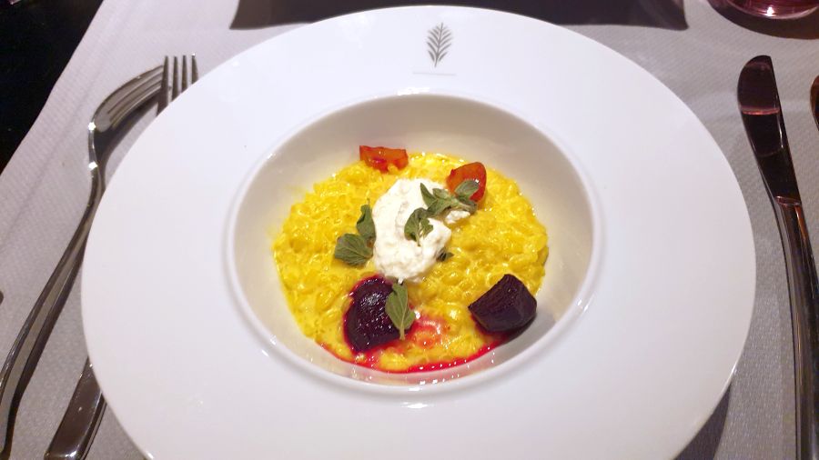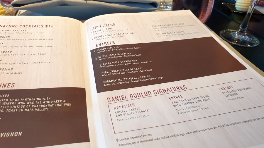 Het diner heb ik in Luminae, het restaurant van The Retreat (voor suite gasten). De kledingstijl is deze avond evening chic. Dus een mooie jurk doet het prima. Celebrity Cruises heeft geen gala-avonden waar je in smoking of galajurk hoeft. Op een week cruise zijn er twee avonden waarop je op chic gaat. De traditionele kreeft staat overigens wel op het menu 😉
