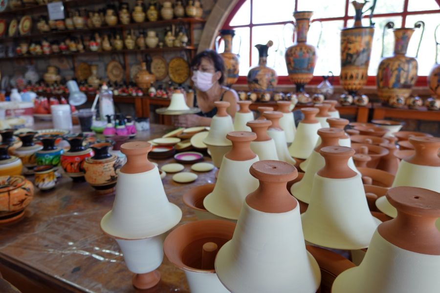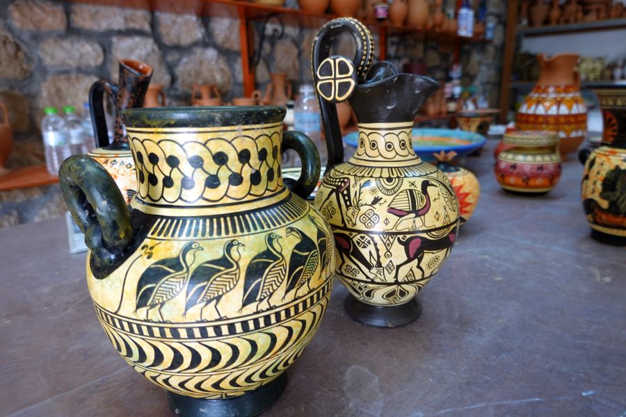 Voor de excursie van vandaag, meld ik mij bij The Club. De grote groepen starten in het theater, maar de kleinere Private Tours in The Club. Met een minibus vertrekken we met 6 man/vrouw naar de andere kant van het eiland, naar Lindos. De Celebrity Apex is namelijk aangekomen in het noorden en Lindos ligt vrijwel in het zuiden, een afstand van zo’n 47 kilometer. Onderweg stoppen we bij een pottenbakkerij die van lokale klei de mooiste producten maakt. Aardig zijn de replica’s van potten die gevonden zijn in Lindos. Zo krijg je toch een beetje het idee van de gebruiksvoorwerpen uit die tijd.