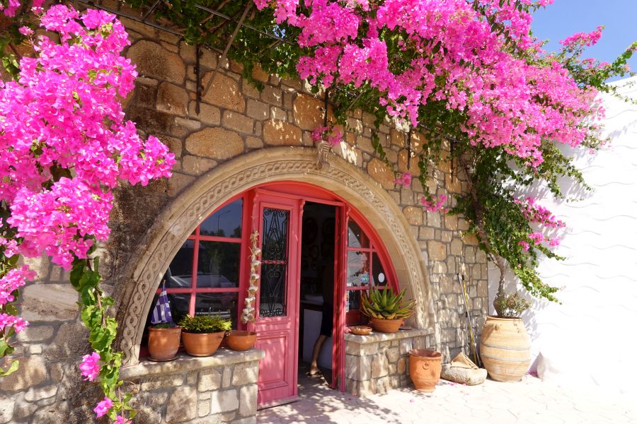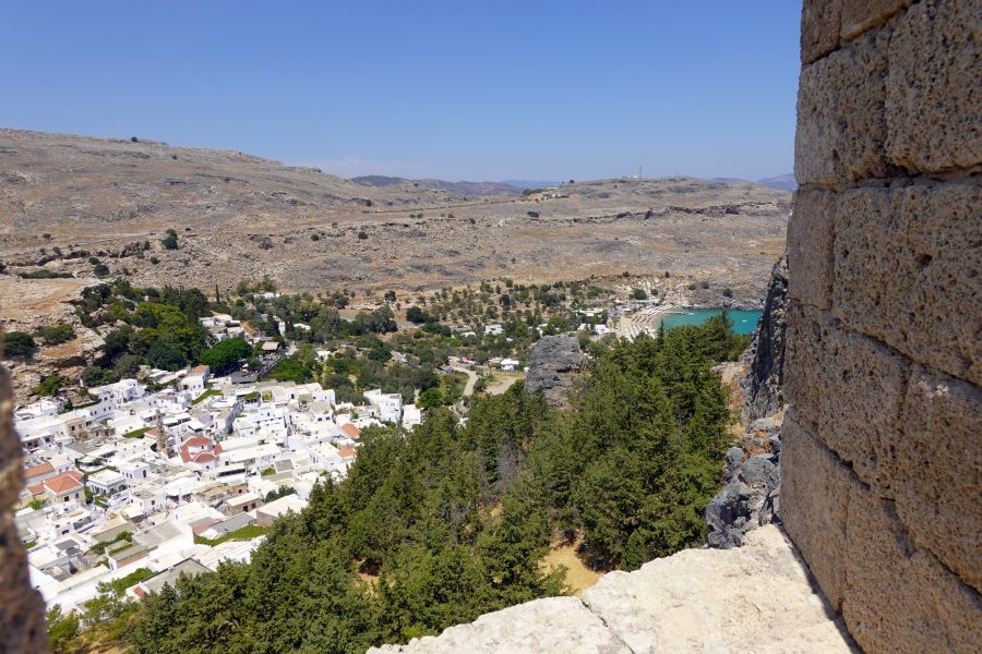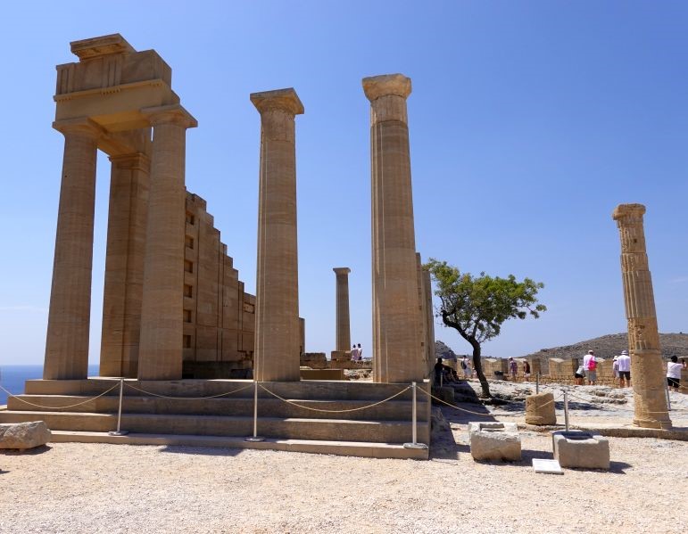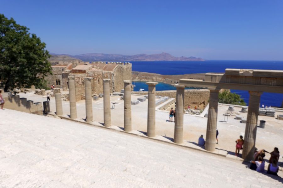In Lindos parkeert onze minibus buiten het dorp op een grote parkeerplaats. Lopend (met een taxi of shuttlebus kan ook) gaan we naar het eerste plein van het dorp. Vanaf daar zijn er talloze straatjes met souvenirwinkeltjes die uiteindelijk naar het startpunt van de berg met de oude tempels leiden. We bezoeken Lindos vanwege de immense overblijfselen op de berg naast het dorp. Deze stammen uit 550 voor Christus en zijn in loop ter tijden aangevuld of vernietigd. Helaas liggen alle schatten die men ooit gevonden heeft, nu in Kopenhagen in een museum.