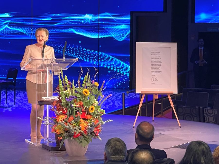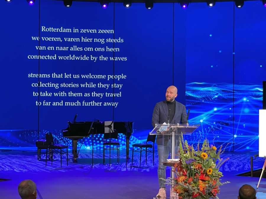 Mai Elmar, directeur van Cruise Port Rotterdam en tevens madrina van de Rotterdam, overhandigde een speciaal gedicht over de Rotterdam, geschreven en voorgedragen door dichter Derk Otte.