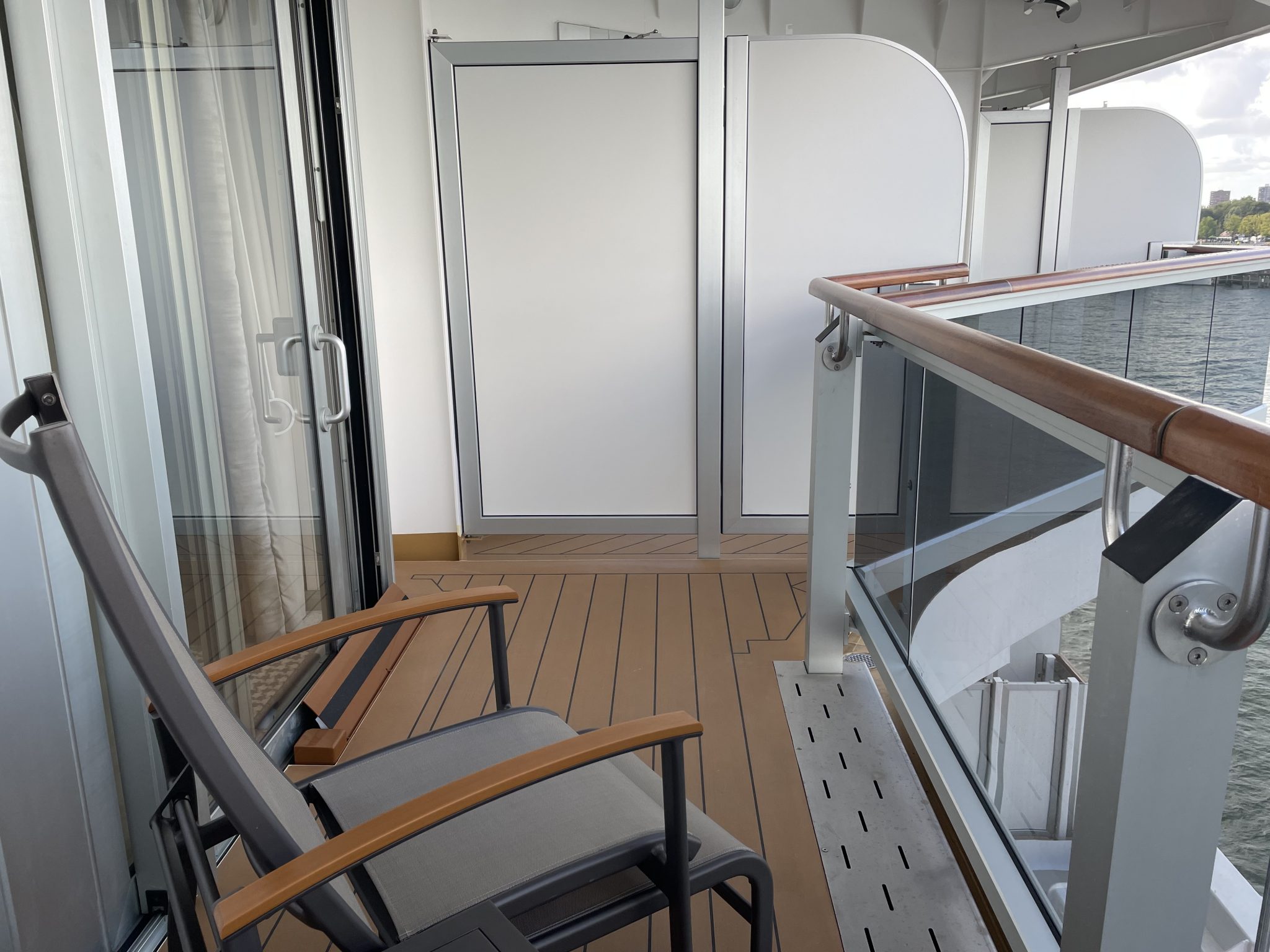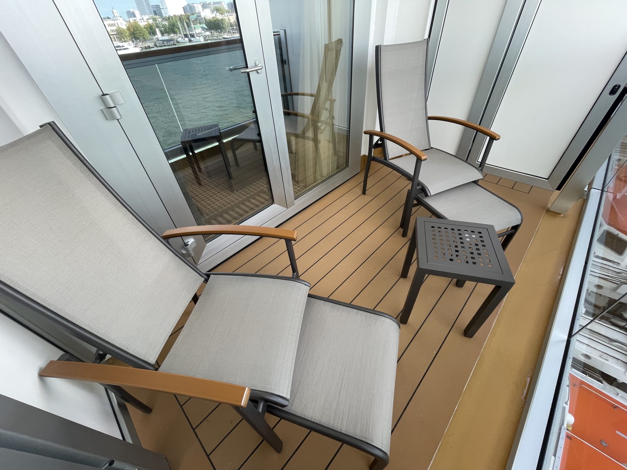Veruit de grootste categorie op de Rotterdam zijn de balkonhutten (710 stuks). Deze ‘veranda’-hutten bieden ten opzichte van de binnen- en buitenhutten meer ruimte maar bovenal eerste ring uitzicht op zee danwel bestemming. De privé buitenruimte beschikt over een tafel en twee zit-of ligstoelen (afhankelijk van het type). Net als in de buitenhut is er een (kort) bankje met tafeltje en worden dezelfde kleuren gehanteerd. De oppervlakte is 21-38 vierkante meter inclusief veranda. In één van de kastjes vind je naast alle eerder genoemde voorzieningen ook twee dekens die je op het balkon kunt gebruiken als het wat frisser is. Hieronder zie je hut 6142.