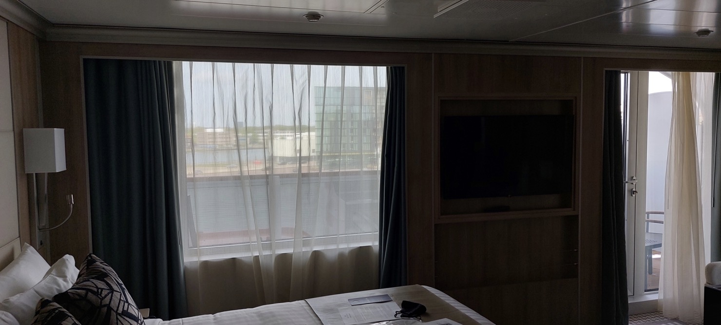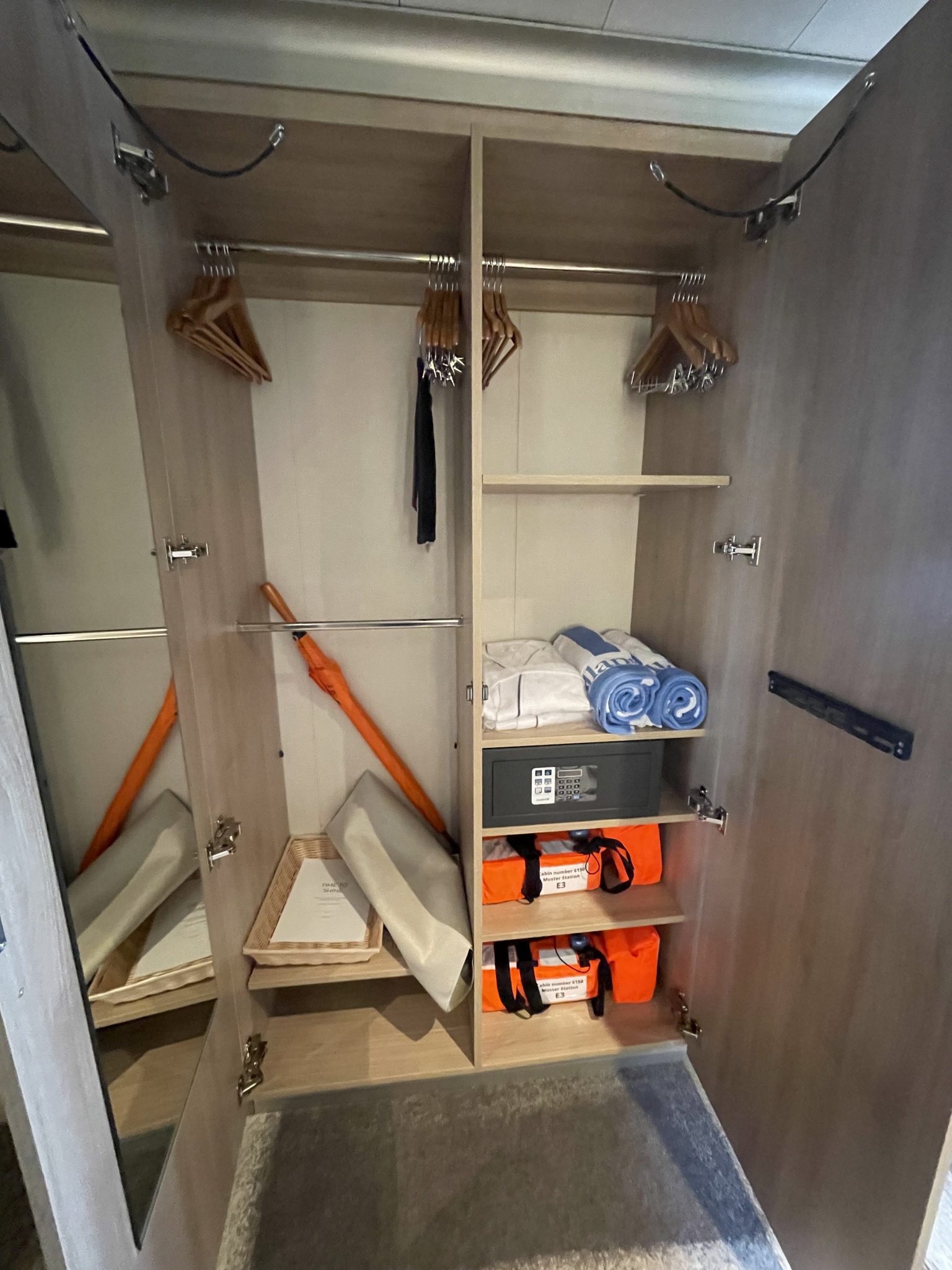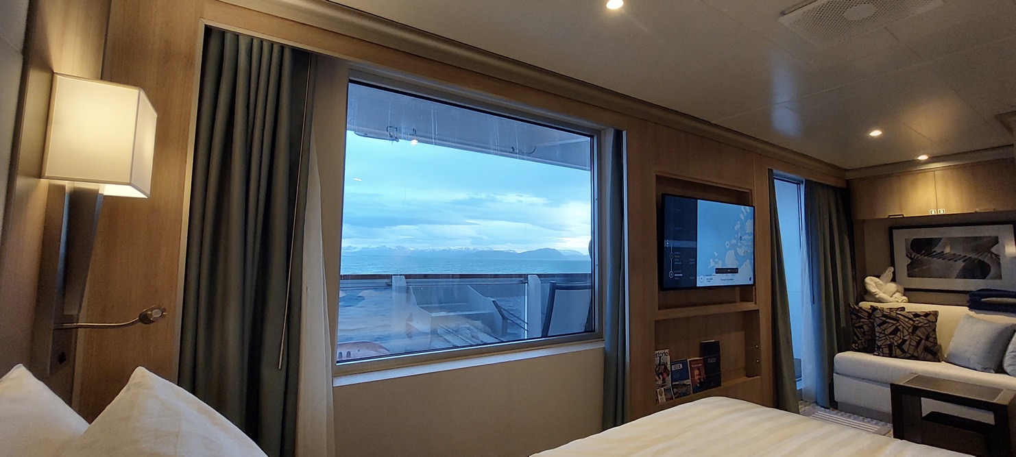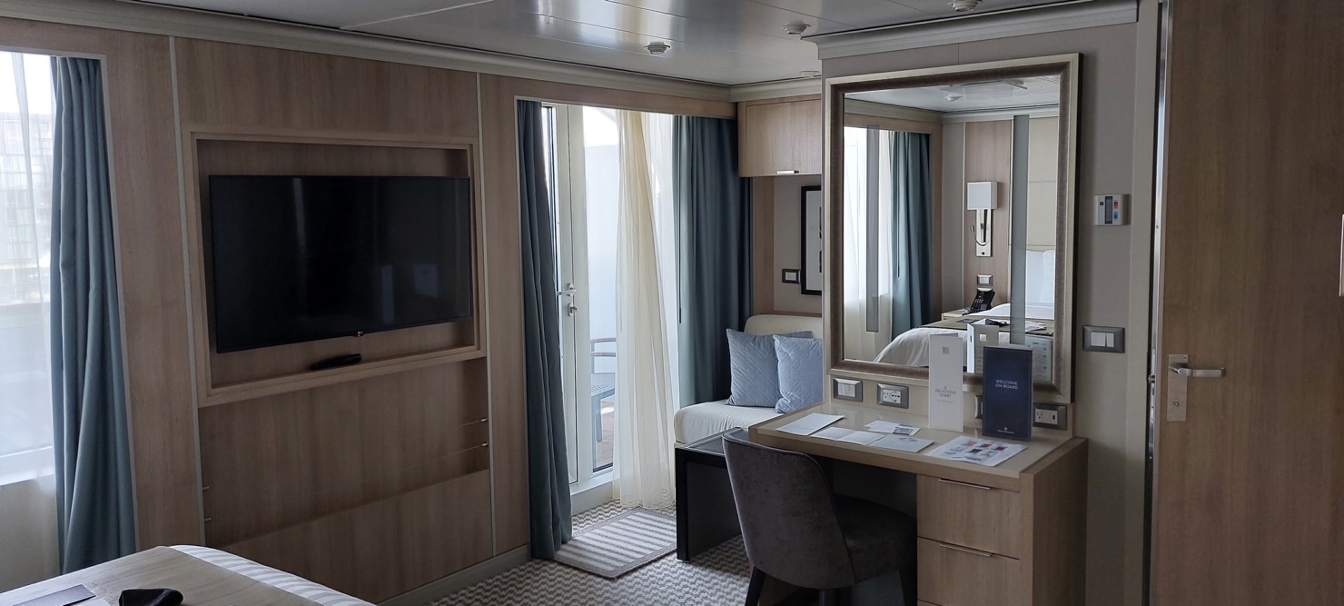 De balkonhut voor mindervaliden zie je op de foto’s hieronder. Deze heeft uiteraard meer ruimte, een aangepaste badkamer en een balkon met drempel die naar beneden geklapt kan worden voor een gemakkelijke doorgang. Hieronder zie je hut nr. 6150.
