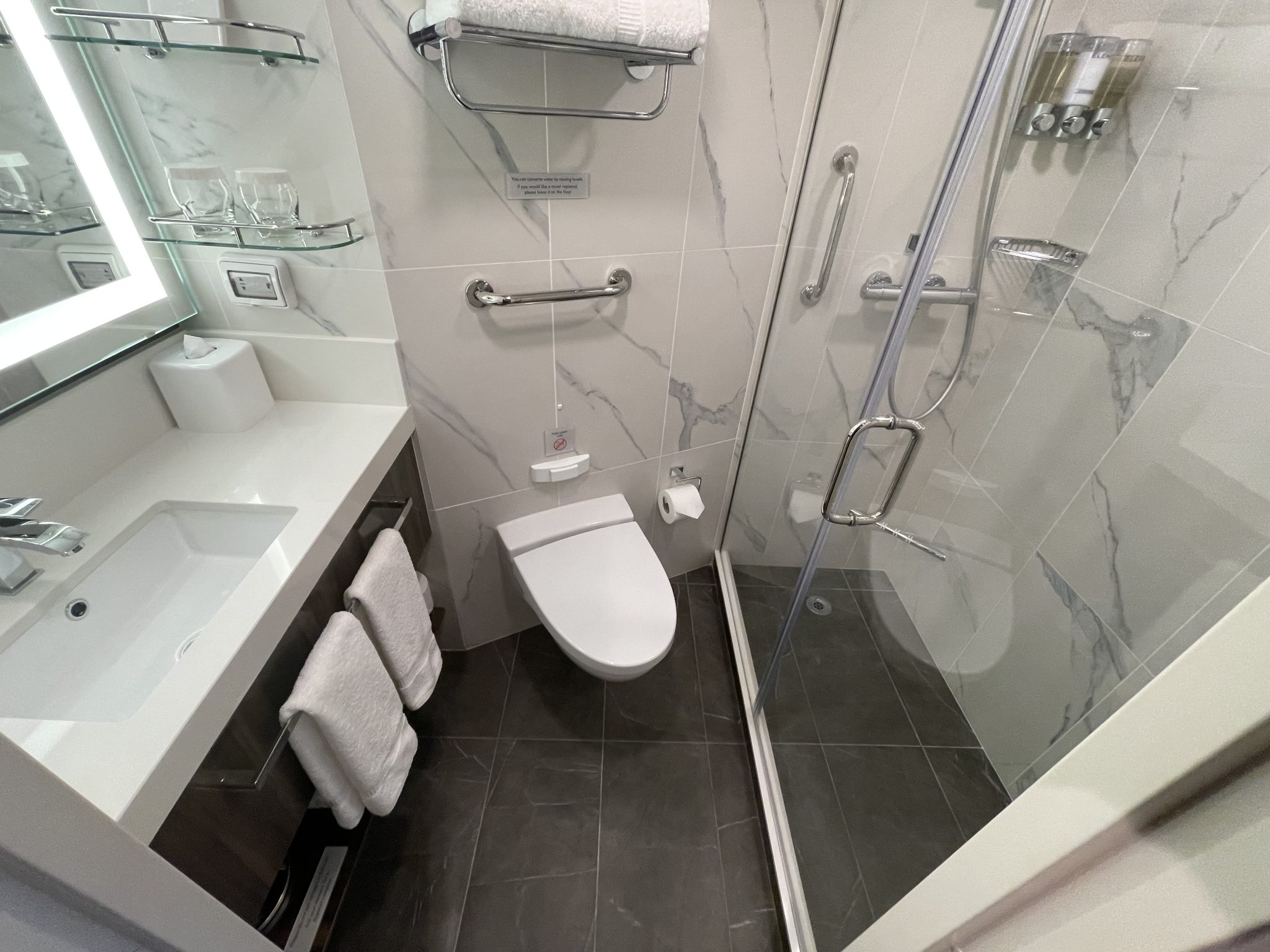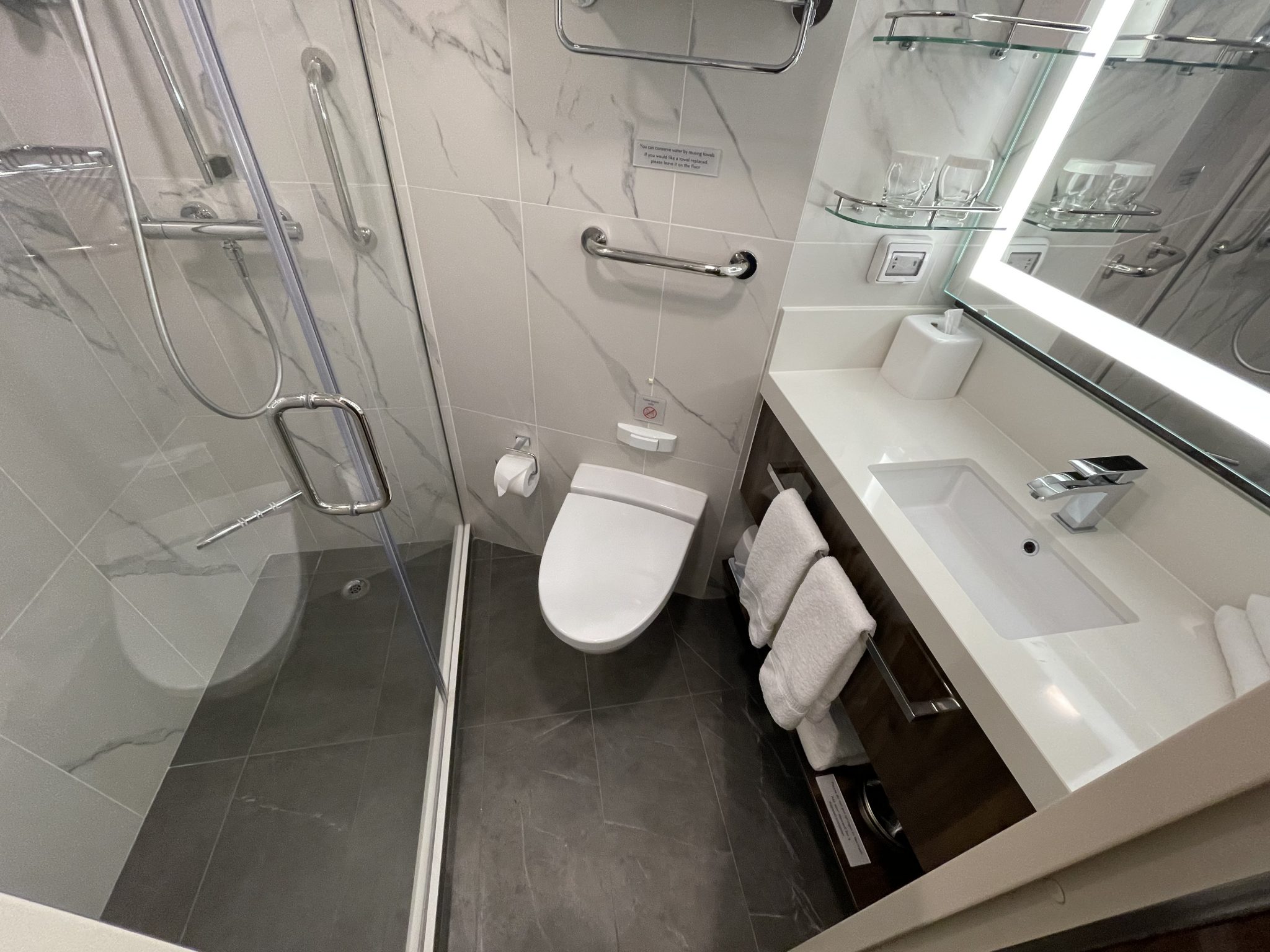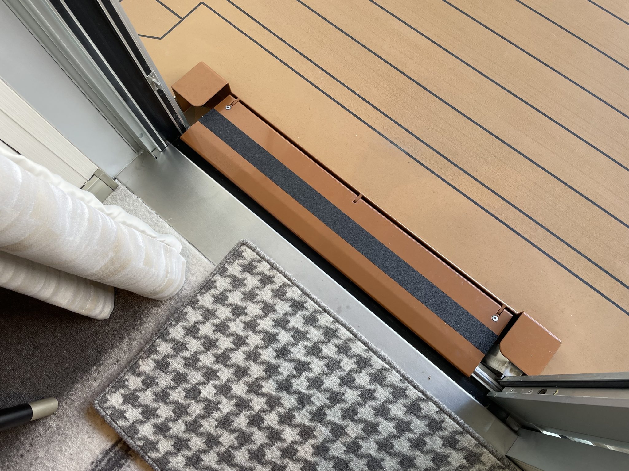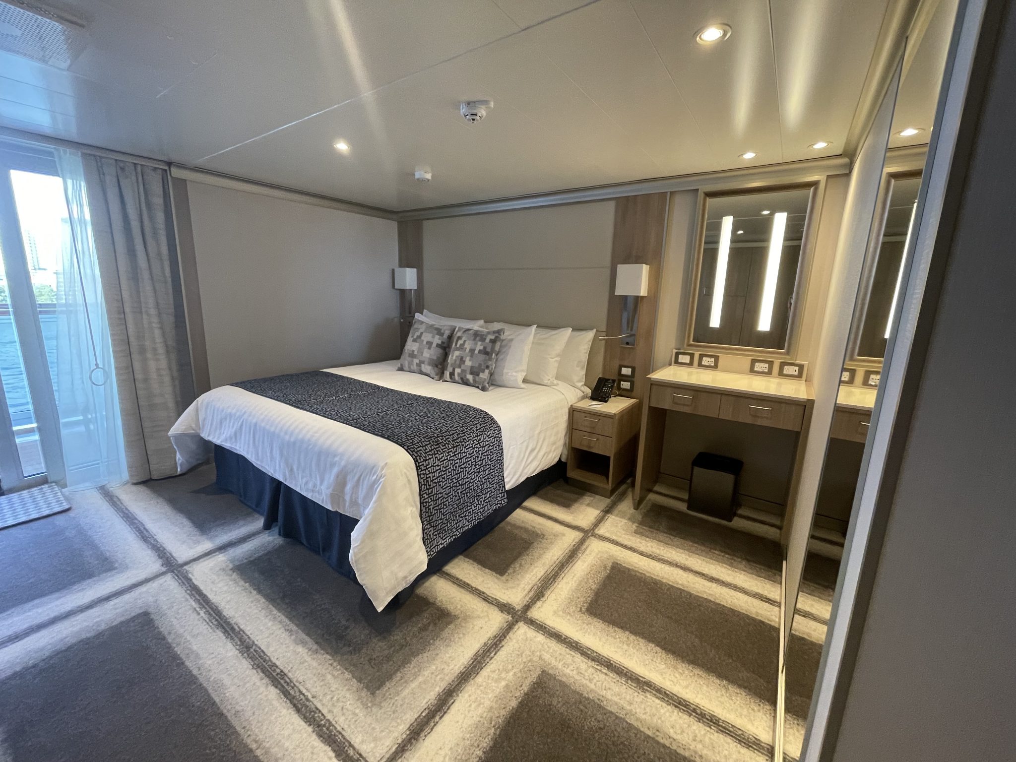 De balkonhut voor mindervaliden zie je op de foto’s hieronder. Deze heeft uiteraard meer ruimte, een aangepaste badkamer en een balkon met drempel die naar beneden geklapt kan worden voor een gemakkelijke doorgang. Hieronder zie je hut nr. 6150.
