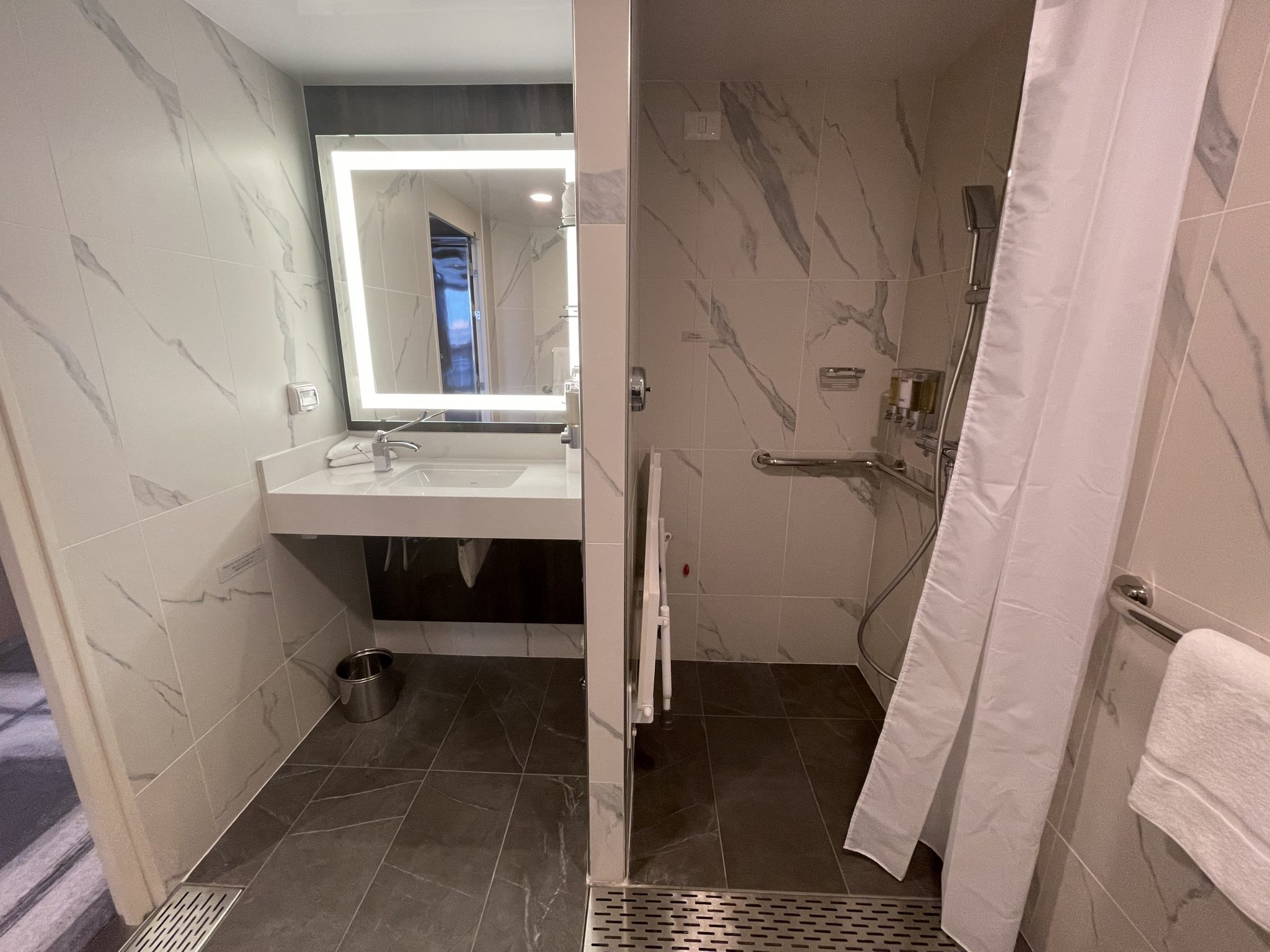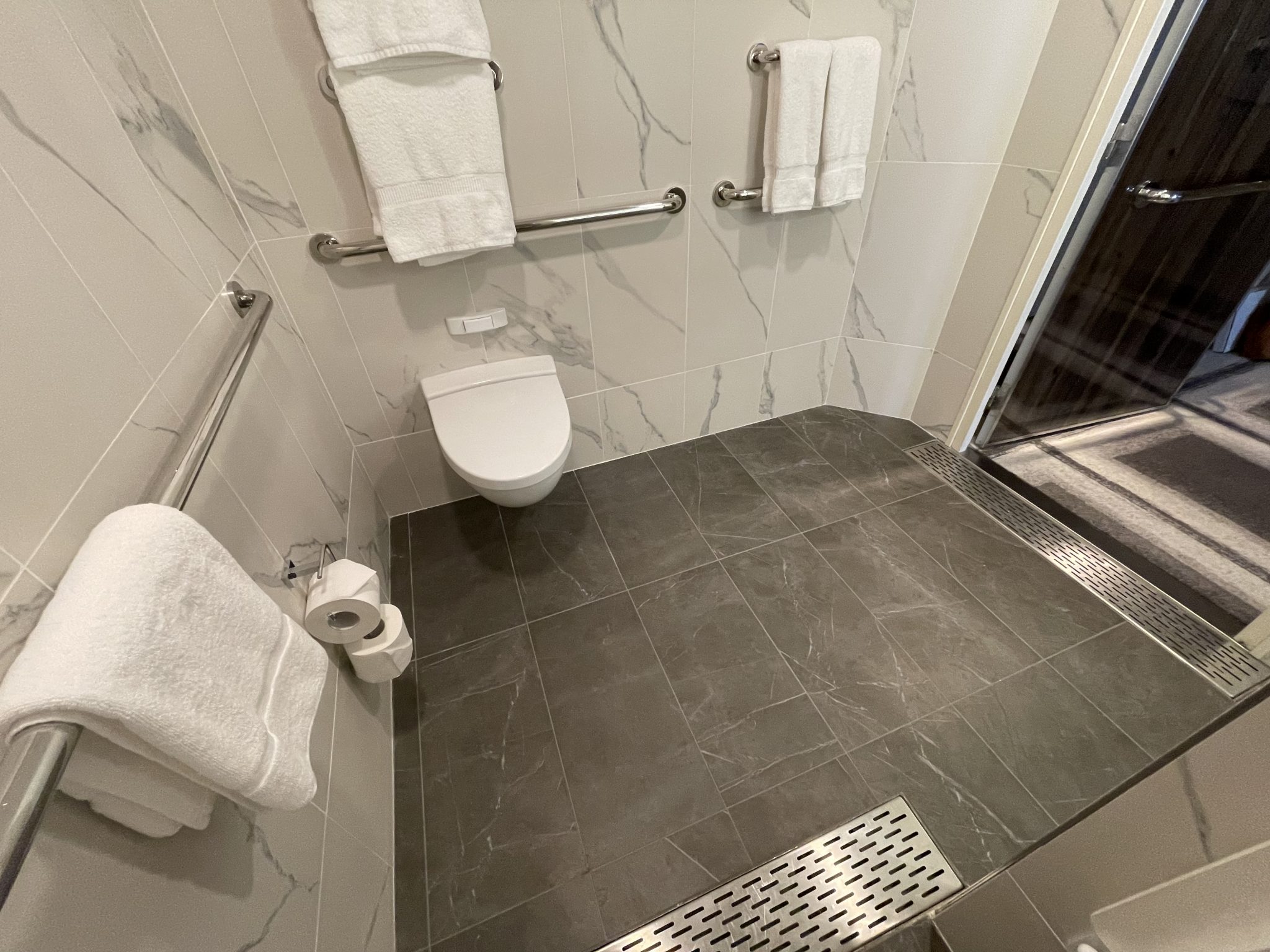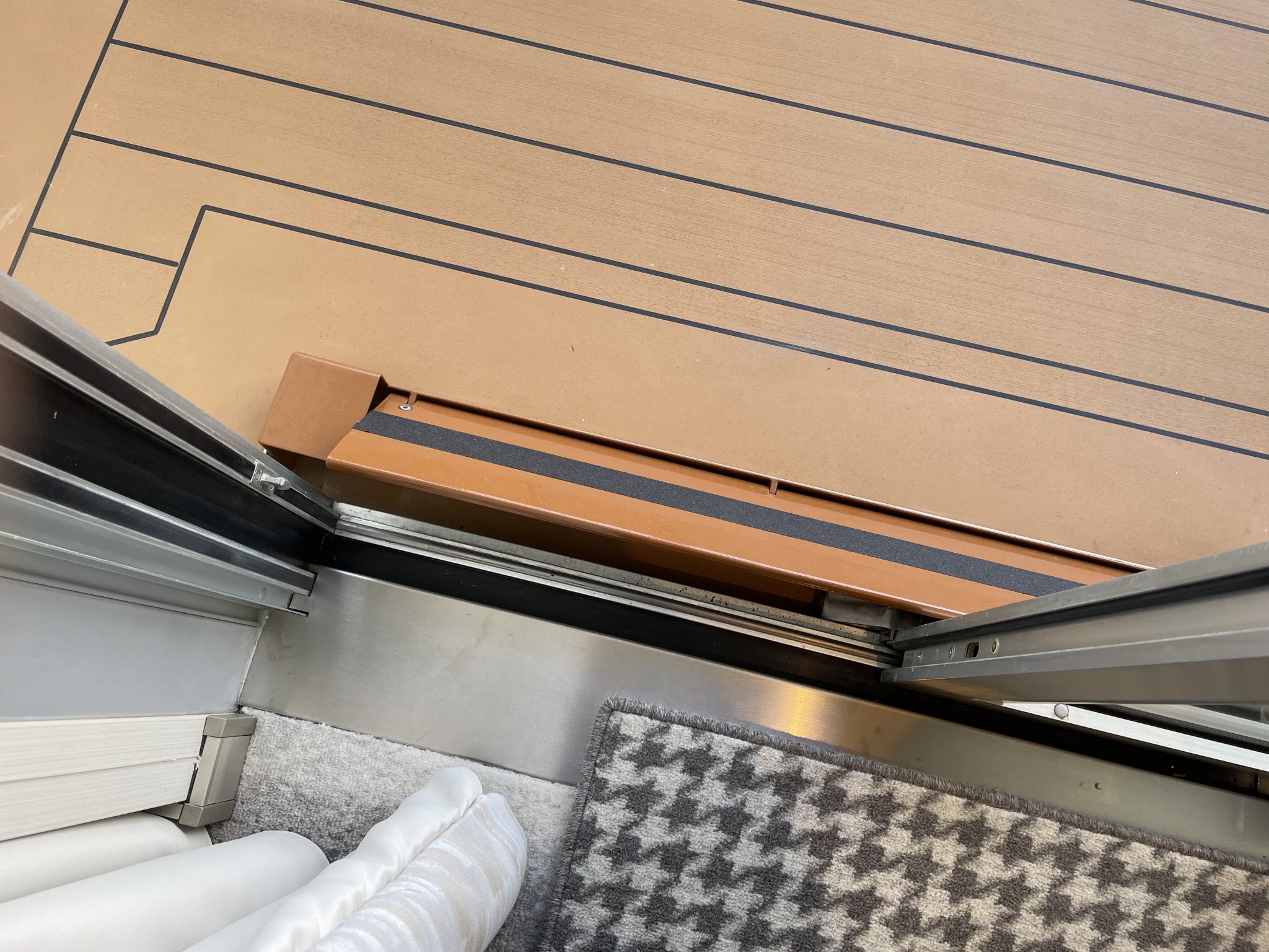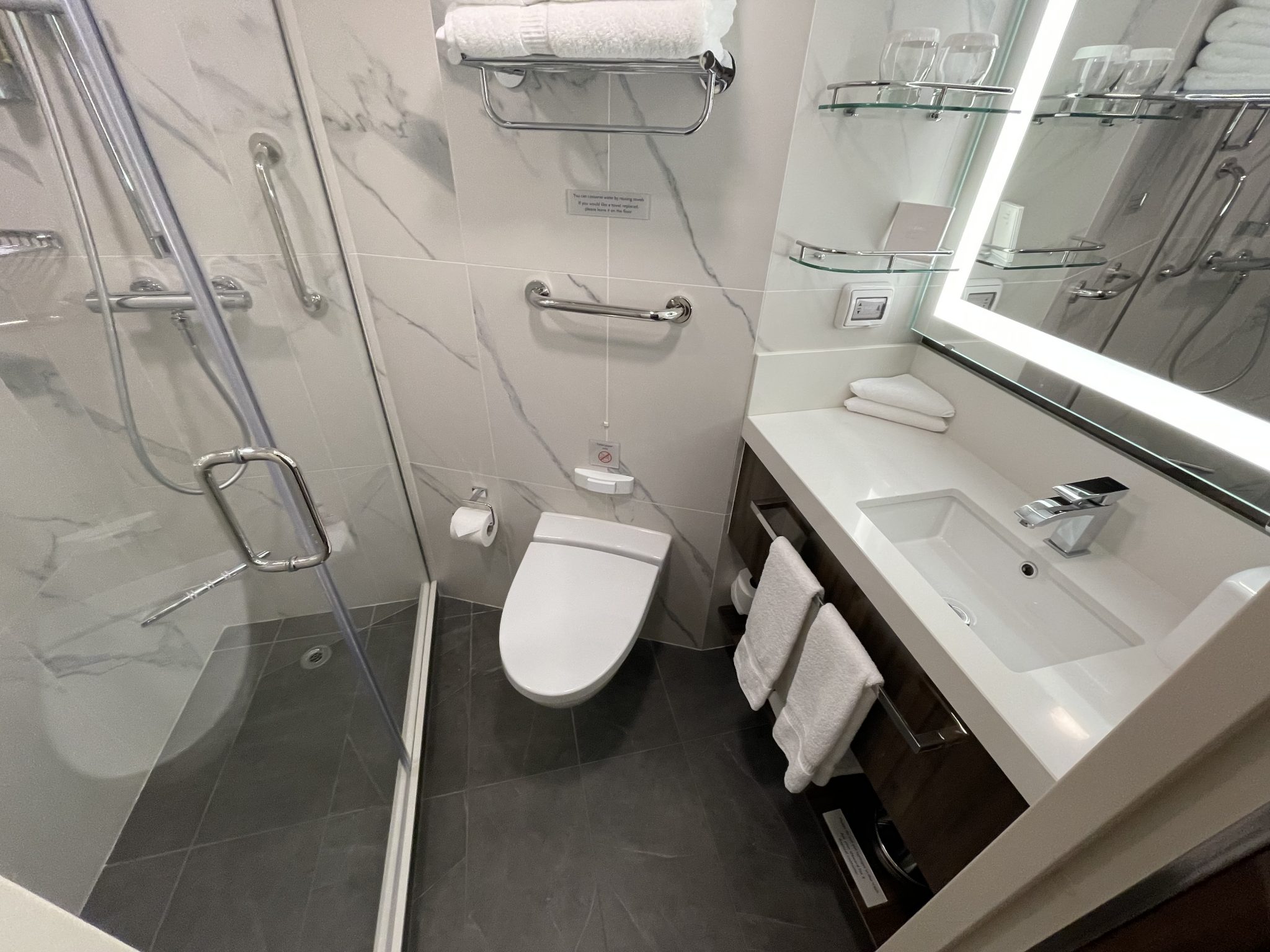 De balkonhut voor mindervaliden zie je op de foto’s hieronder. Deze heeft uiteraard meer ruimte, een aangepaste badkamer en een balkon met drempel die naar beneden geklapt kan worden voor een gemakkelijke doorgang. Hieronder zie je hut nr. 6150.