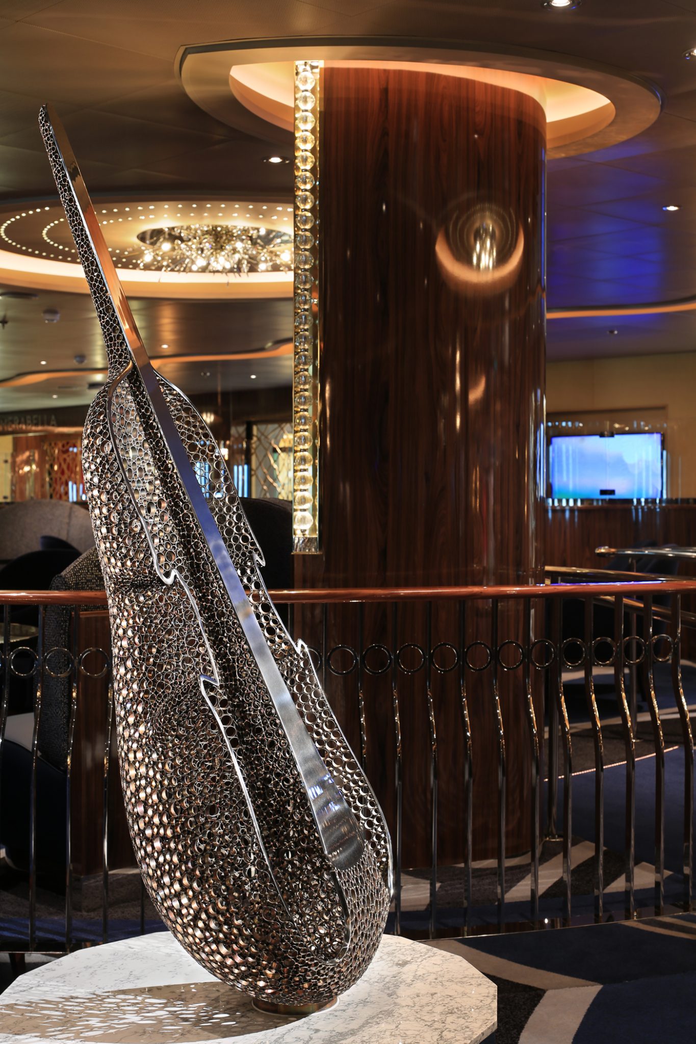 - Het grootste en duurste stuk is “Harps”, een roestvrijstalen sculptuur van 7,5 ton in het Atrium dat drie dekken beslaat. Met dynamische kleurveranderende spotverlichting en een spiegelplafond vormt het werk een opvallend brandpunt aan boord. “Harps” is geproduceerd en ontworpen door ArtLink, gebaseerd op een concept van Tihany Design. Geschatte waarde ligt rond de $620.000.