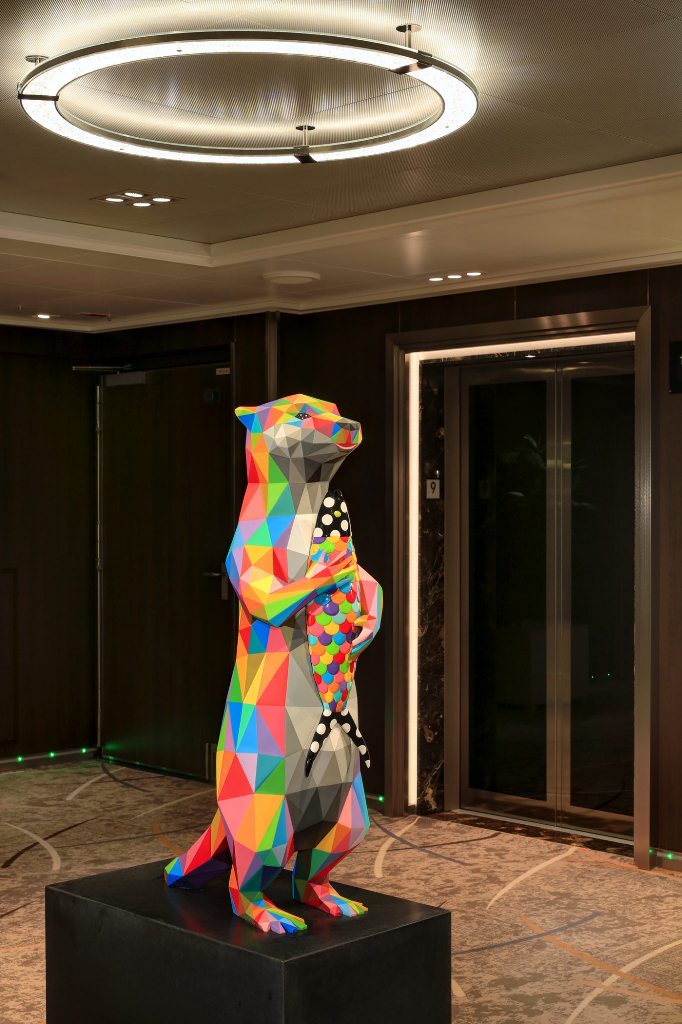 - Beschouwd als een van de meest avant-gardistische stukken in de collectie is een glasvezelsculptuur van een otter in de achterste trappenhal op dek 9 door de Spaanse kunstenaar Okuda San Miguel. San Miguel staat bekend om zijn kenmerkende stijl van kleurrijke geometrische patronen die dieren, schedels, religieuze iconografie en menselijke figuren uitbeelden.