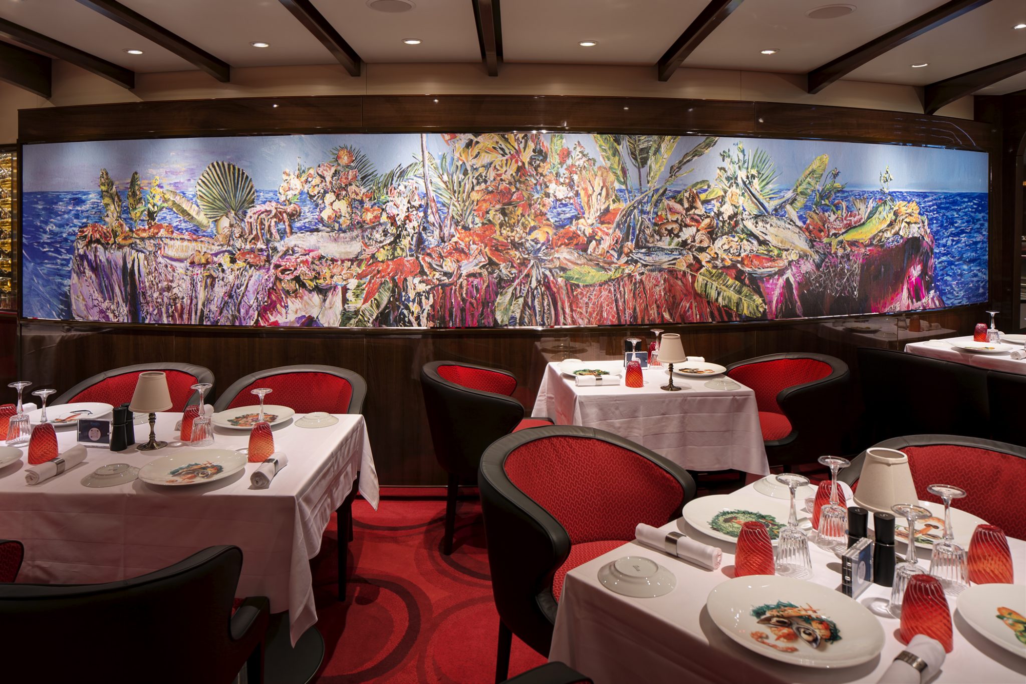 - Het levendige werk van Lisa Krannichfield is te zien in het specialiteitenrestaurant Club Orange. Haar stukken versmelten de grens tussen mannelijk en vrouwelijk en onderzoeken wat het betekent om modieus te zijn en een statement te maken.