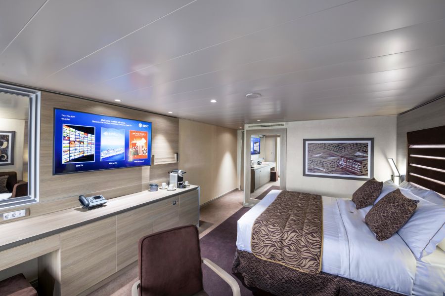 De 78 deluxe suites (incl. 1 voor mindervaliden) zijn 28m2 groot. Inclusief in deze suite zijn een minibar die tweemaal per dag gevuld wordt en 24 uur per dag roomservice. Het Nespresso apparaat staat voor je klaar met 3 soorten koffie. Nabij de badkamer met een grote inloopdouche, bevindt zich kastruimte. Ook onder het bureau zijn een aantal lades en kastjes om spullen op te bergen. (foto’s: MSC Cruises)