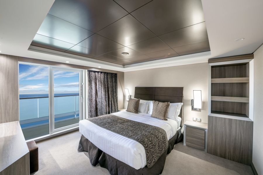 De Aurea Suites, Grand Suites en Hoeksuites liggen op een hoek aan de voorkant van het schip. Ze variëren in grootte van 25 m2 (Hoeksuites met whirlpool) tot 39 m2. Je hebt een ruime woonkamer en een masterbedroom. Daarnaast is er een aparte inloopkast. Op het balkon heb je een whirlpool, twee ligbedden en een tafeltje met twee stoelen.