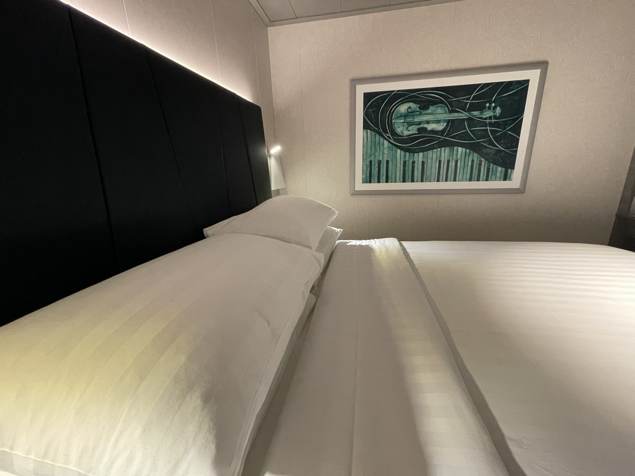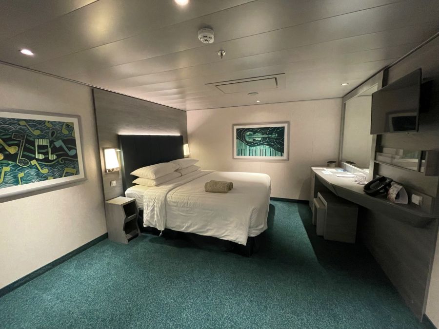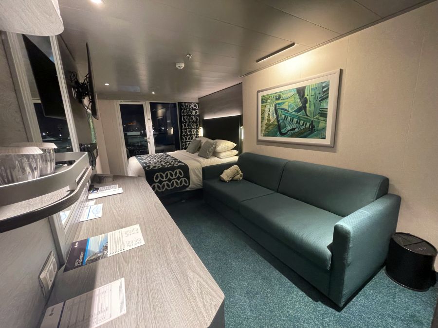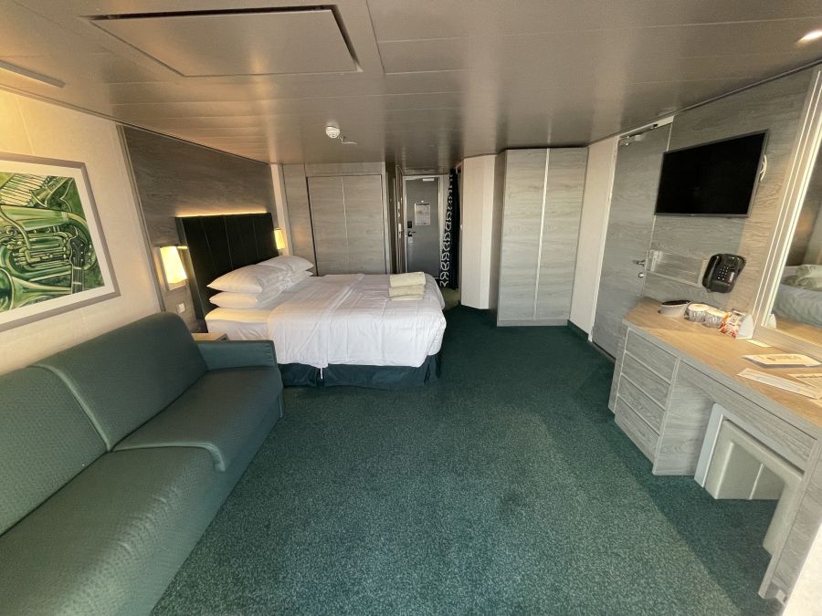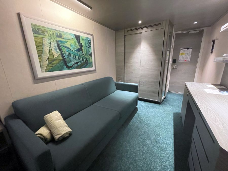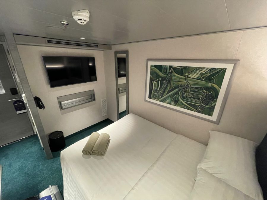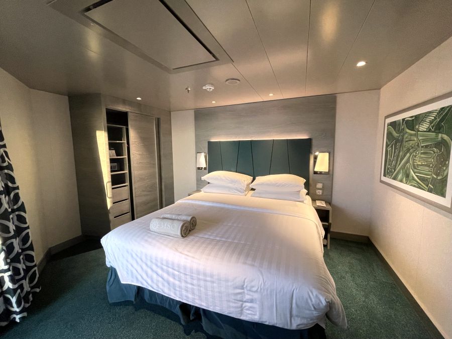 De kleurstelling van alle kamers op de MSC Virtuosa voelt, ten opzichte van bijvoorbeeld de MSC Bellissima (geel en donkerhout) en MSC Grandiosa (rood), gelukkig toch weer wat lichter aan. Groen is de hoofdkleur op de Virtuosa. De gordijnen en sierkussens zijn voorzien van witte blaadjesfiguren.