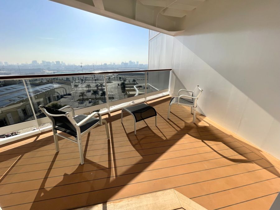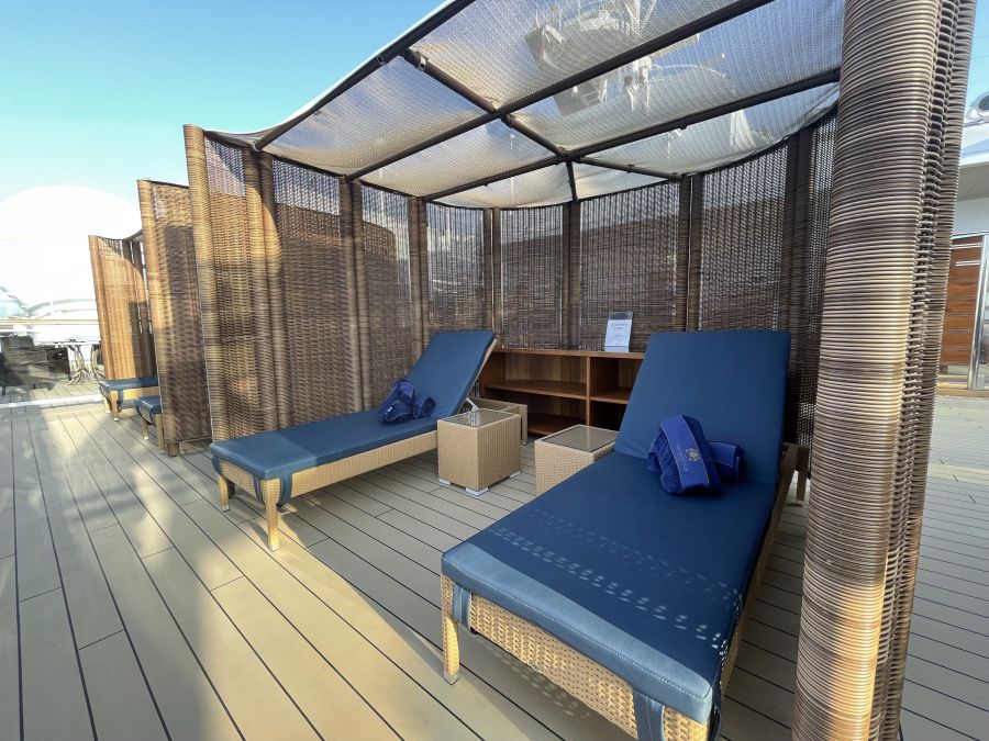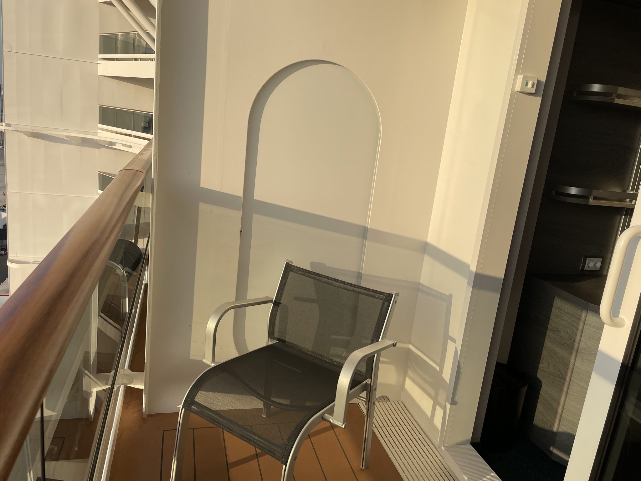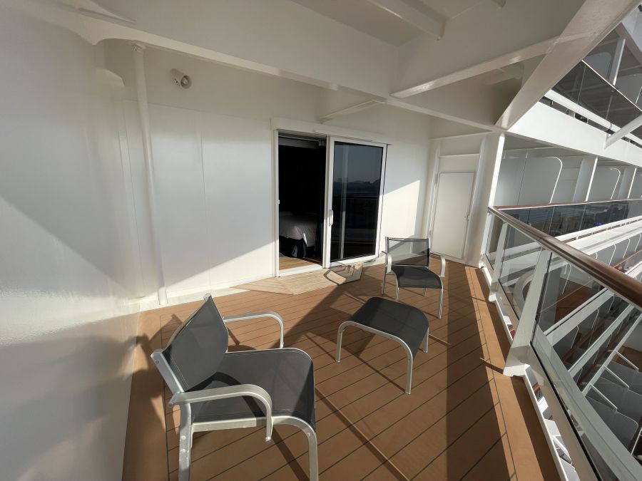 Ik wil je wel een tip meegeven als je een zonaanbidder bent: vermijd zeker de bovenste 2 dekken die in een inham gelegen zijn, voor én achter. De schaduw van het overhangende dek daarboven, is immens. Je hebt vrijwel geen zon op deze balkons.