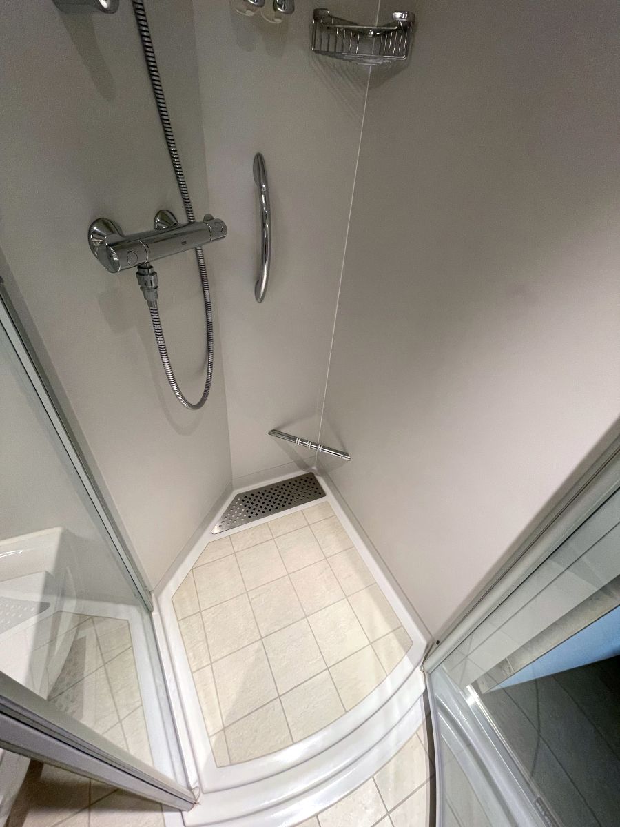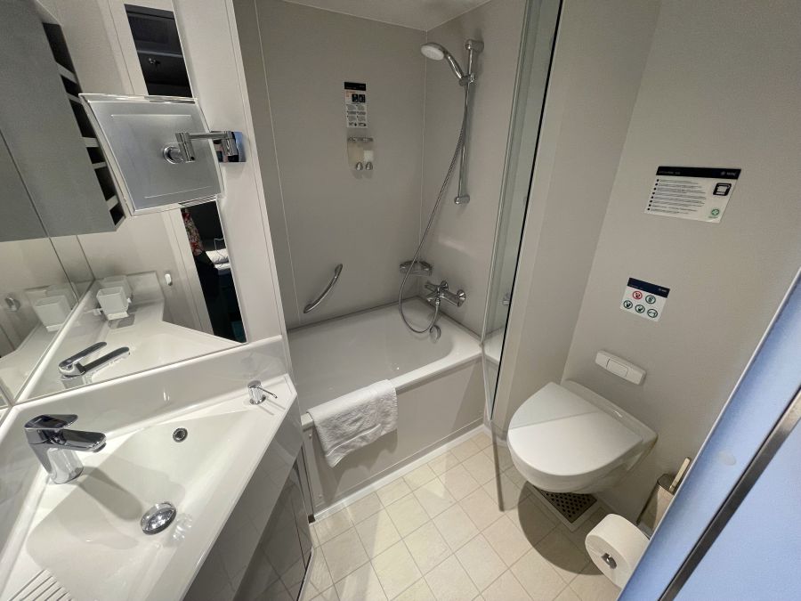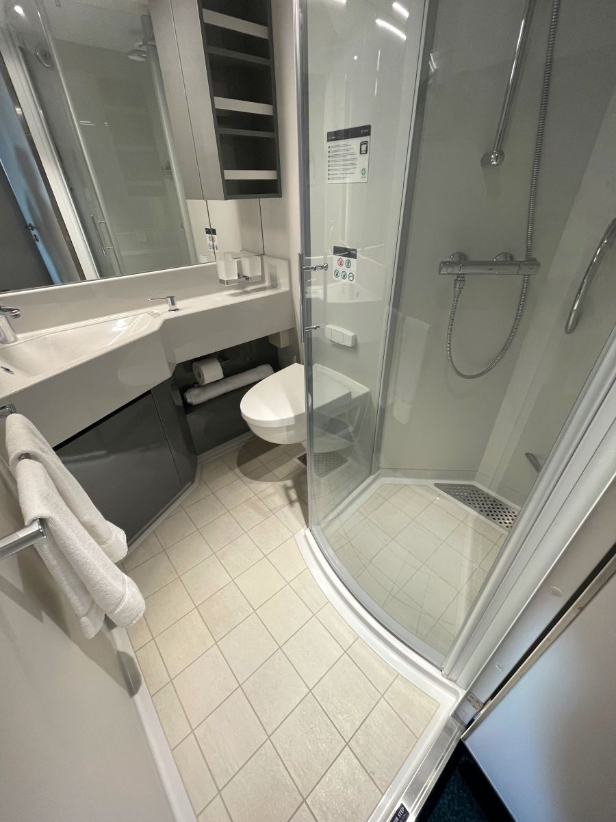 Elke hut (binnen, buiten en balkonhut) heeft dezelfde standaard badkamer. In de douche hangt in flacons aan de muur een shampoo en shower gel. Of het door de Coronatijd komt of niet, de badkamer heeft geen extra’s meer zoals bv een los zeepje. Deze zit alleen in de dispenser aan de zijkant van de wasbak. De glazen bekers zijn uit de houder te halen, maar zitten eigenlijk in de weg omdat je geen plek hebt om een toilettas neer te zetten 😉 Deze kan je kwijt in het hangende kastje daarboven.